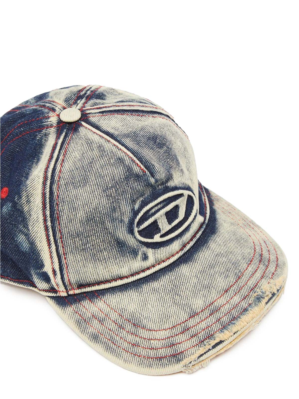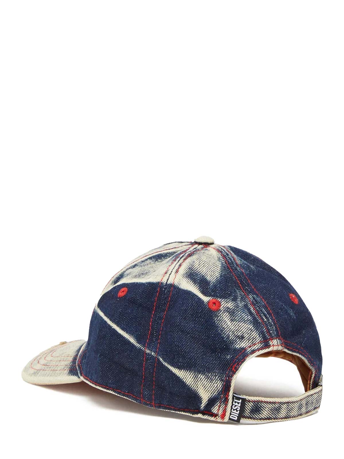 This Diesel Seymon denim cap elevates a classic accessory with an indigo denim aesthetic and an authentic vintage look. Made from 100% cotton for exceptional softness, the design is enhanced by vibrant red details on the stitching and eyelets, creating a bold contrast. The embossed oval D logo centered on the front adds a distinctive and recognizable touch.