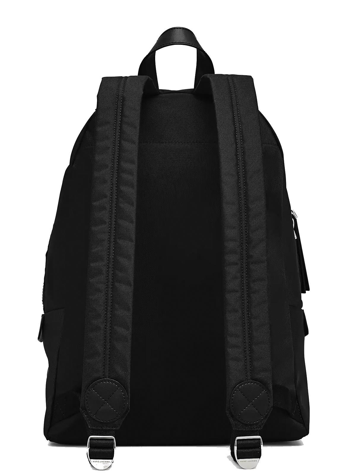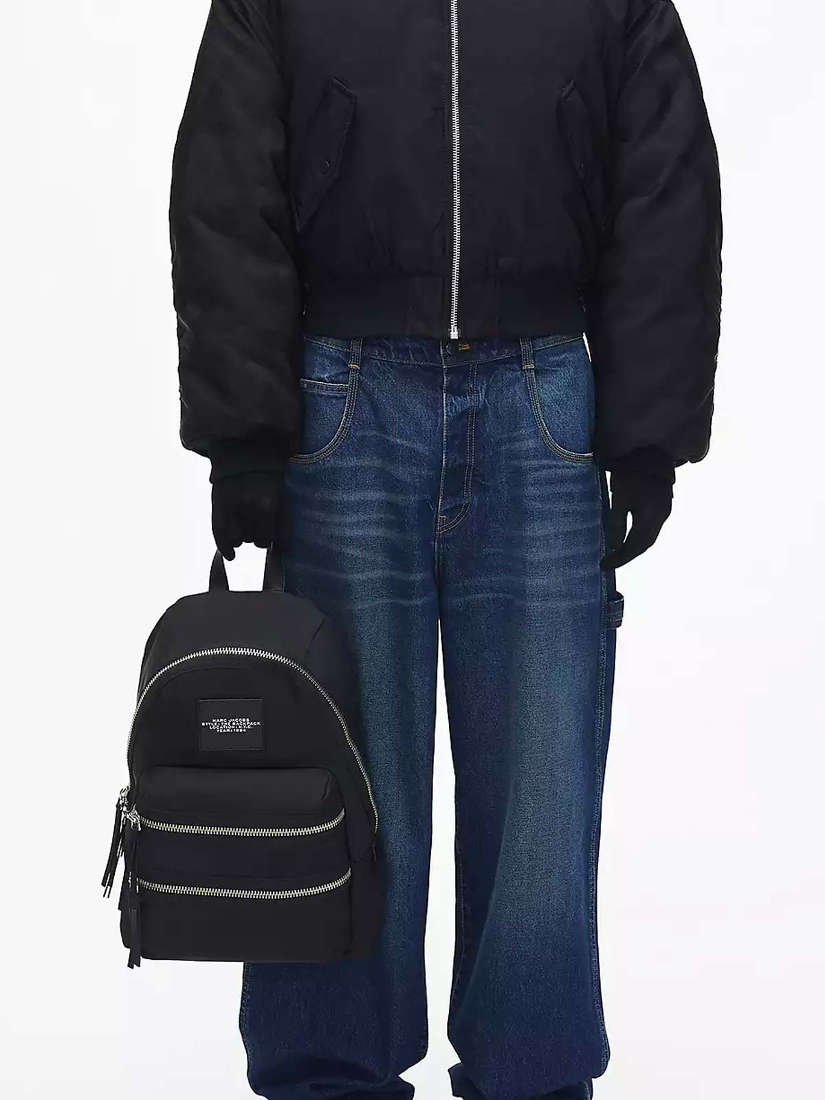 Our renowned Marc Jacobs black nylon large backpack, a true archive piece, returns with a renewed and refined design, perfect for both your adventures and daily use. It features a top handle and slightly padded adjustable shoulder straps, ensuring maximum comfort. Organization is made easy with two external zip pockets, while our distinctive logo patch adorns the front. Inside, the space is generous, ideal for accommodating a laptop and all your essentials.