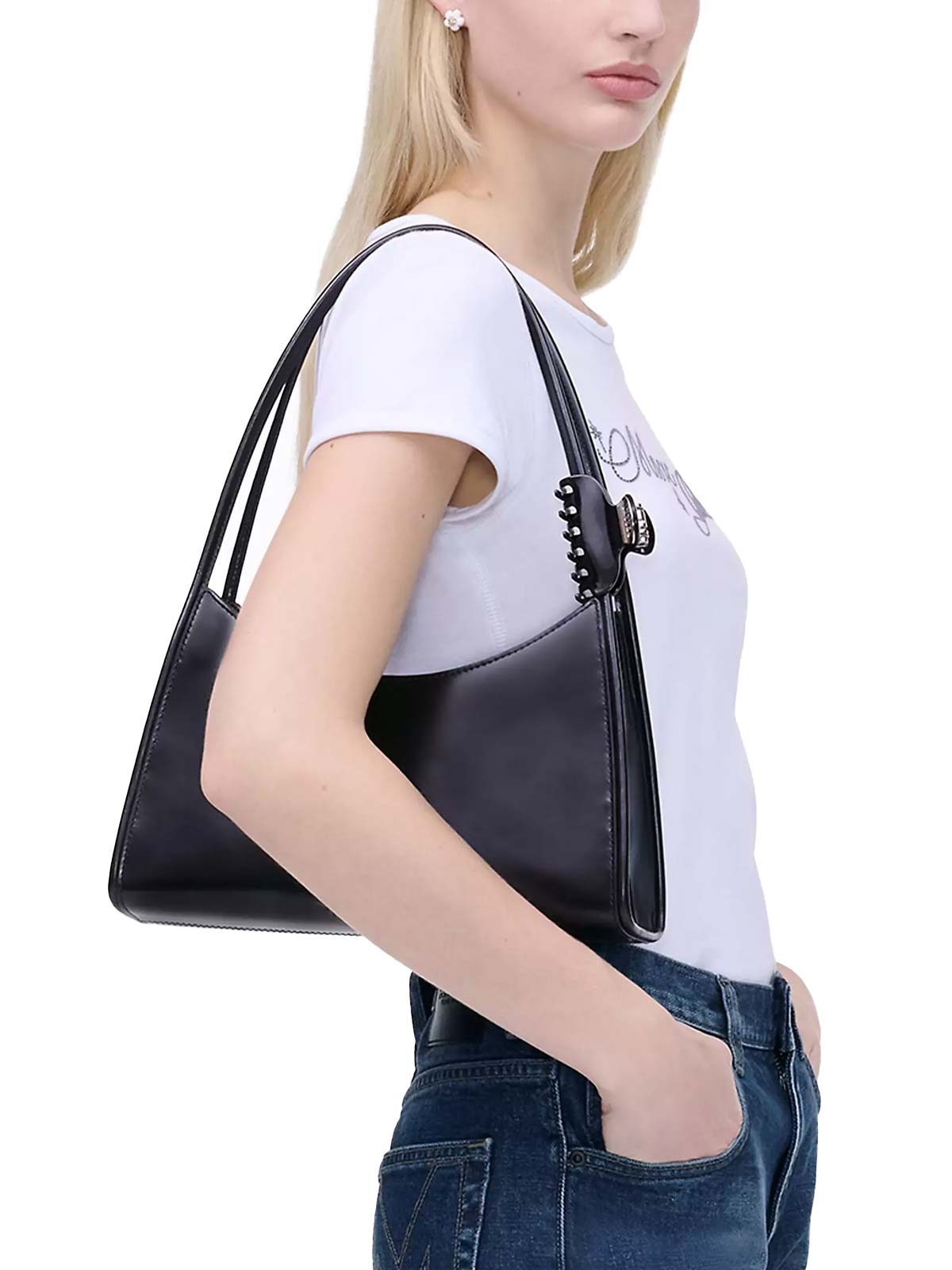 Designed for the dynamic, city-dwelling woman, this Marc Jacobs shoulder bag stands out for its refined aesthetic and impeccable practicality. The distinctive detail is the integrated black Glam Claw clip on the handle, a stylish touch useful for quick hairstyles. Security is ensured by a magnetic closure, while internal and external organization is provided by an exterior slip pocket and dedicated card slots, keeping everything handy and in its place.