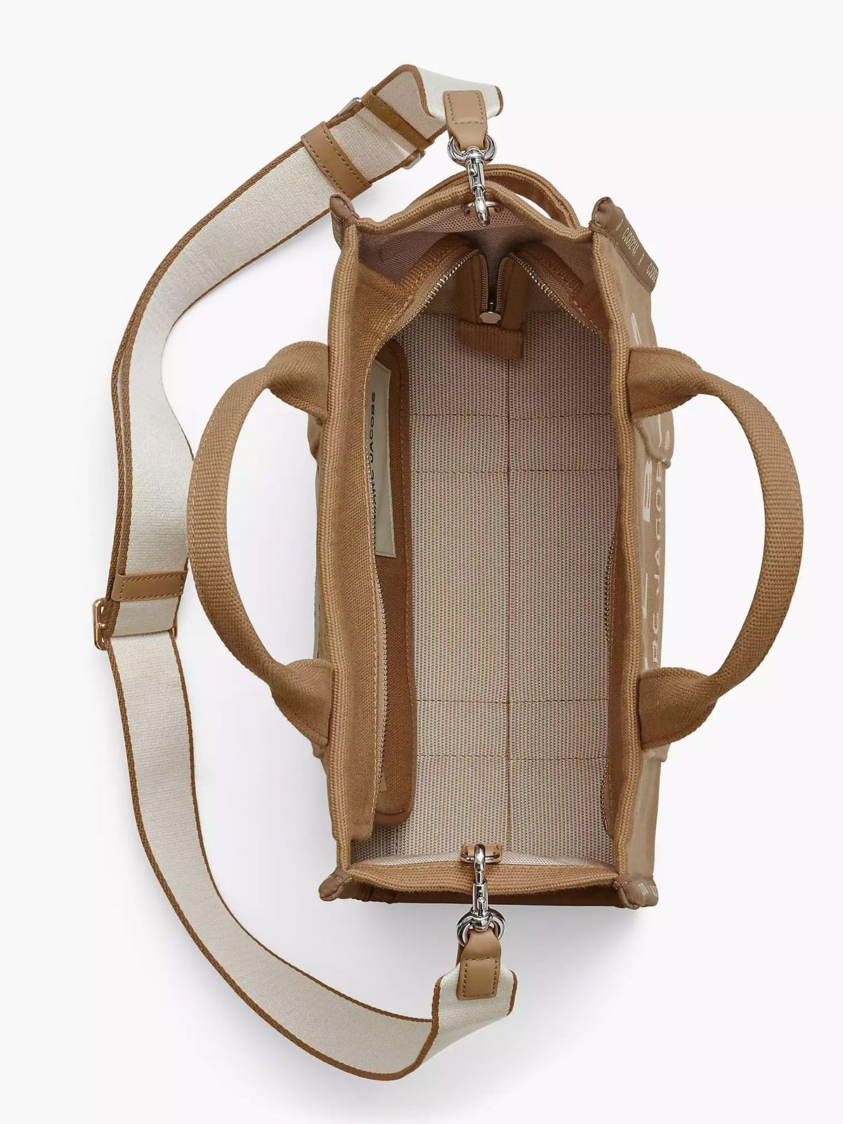 Choose to carry it elegantly by hand or wear it as a crossbody for hands-free convenience. The Marc Jacobs The Tote Bag Small Jacquard Camel is the essential accessory for your style!