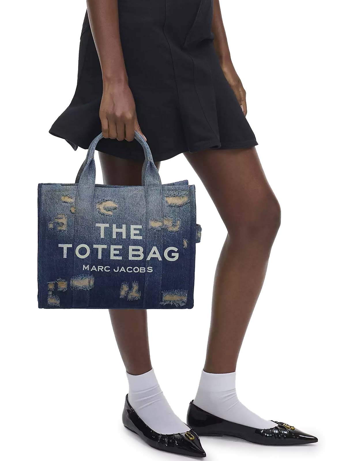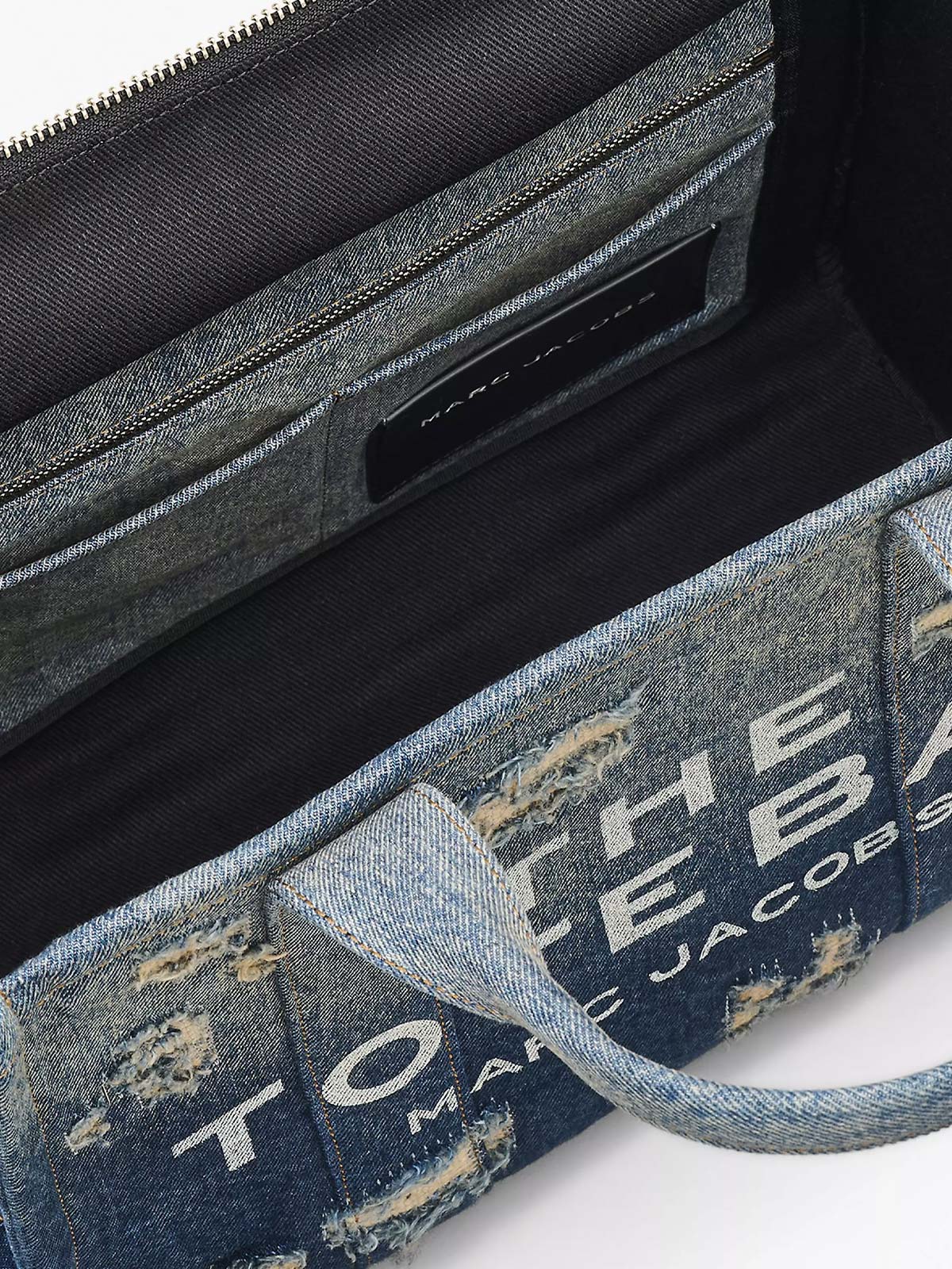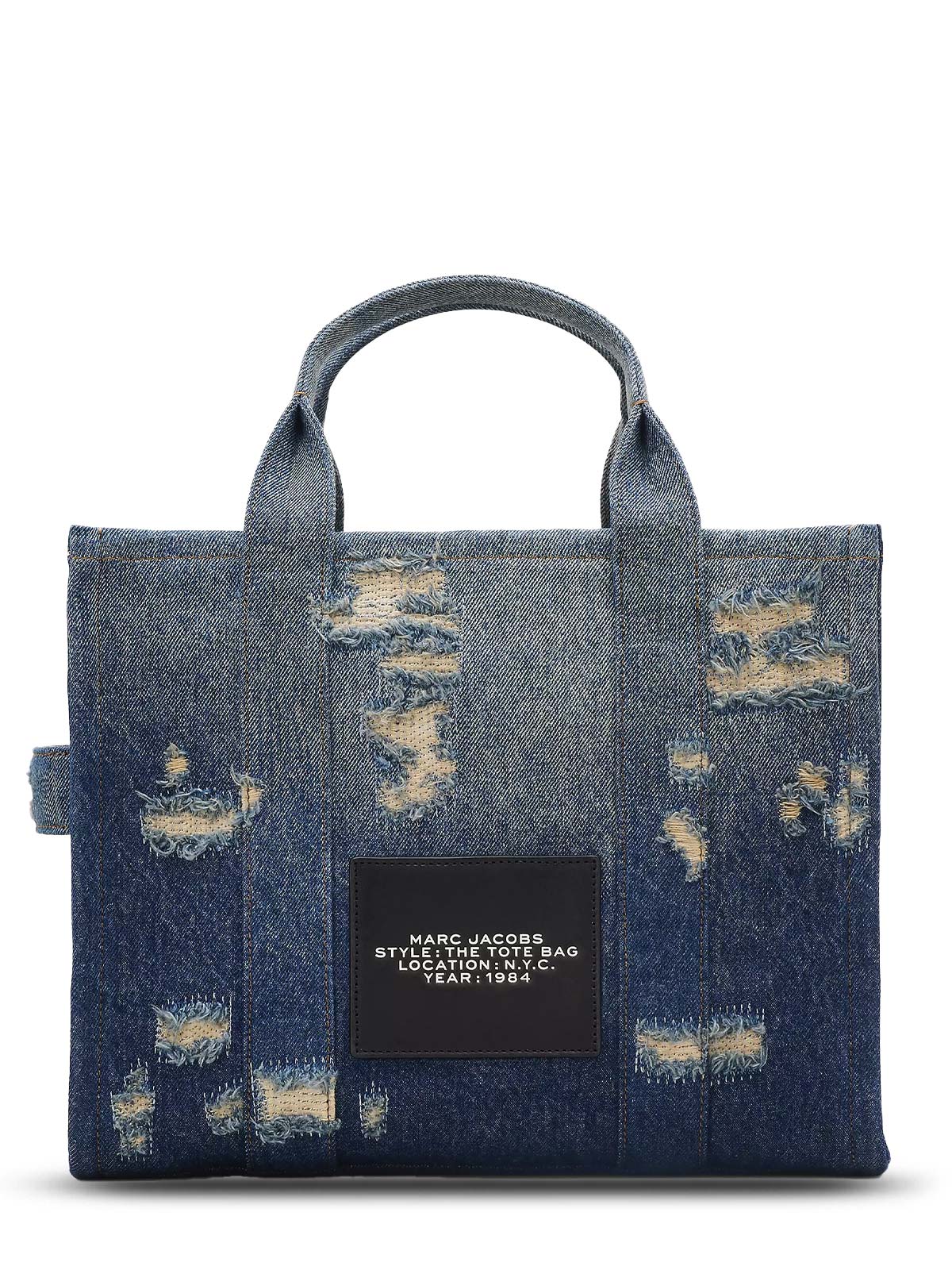 Embrace the unmistakable style of Marc Jacobs with The Denim Small Rip And Repair tote bag, an accessory that blends the durability of blue denim with a bold, contemporary aesthetic. Made entirely from cotton, this bag stands out with its rip details, giving it a well-worn, trendy appeal. The Marc Jacobs logo printed on the front adds an iconic touch, while the two rounded handles and adjustable, removable shoulder strap offer versatility and comfort for any occasion. Silver-tone hardware refines the design, and the top zip closure keeps your belongings secure within a spacious compartment. Designed for the woman who isn't afraid to express her personality, The Denim Small Rip And Repair tote bag is the perfect addition to elevate any look.
