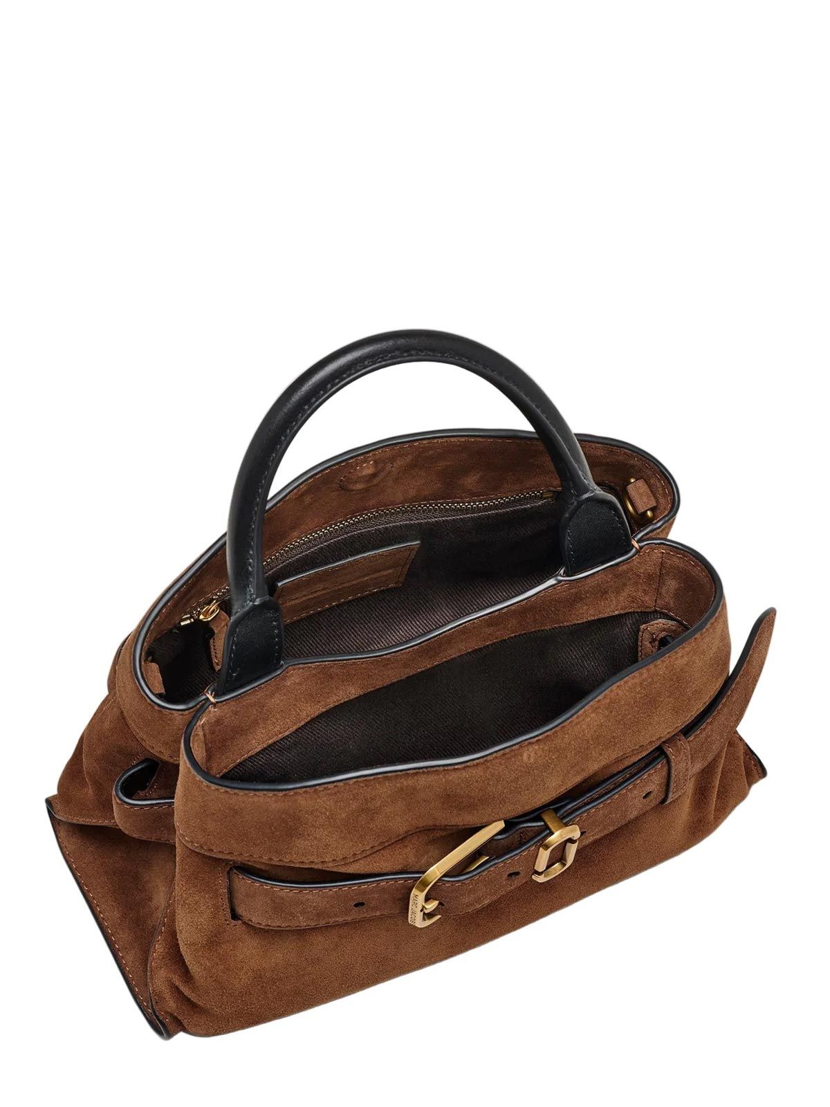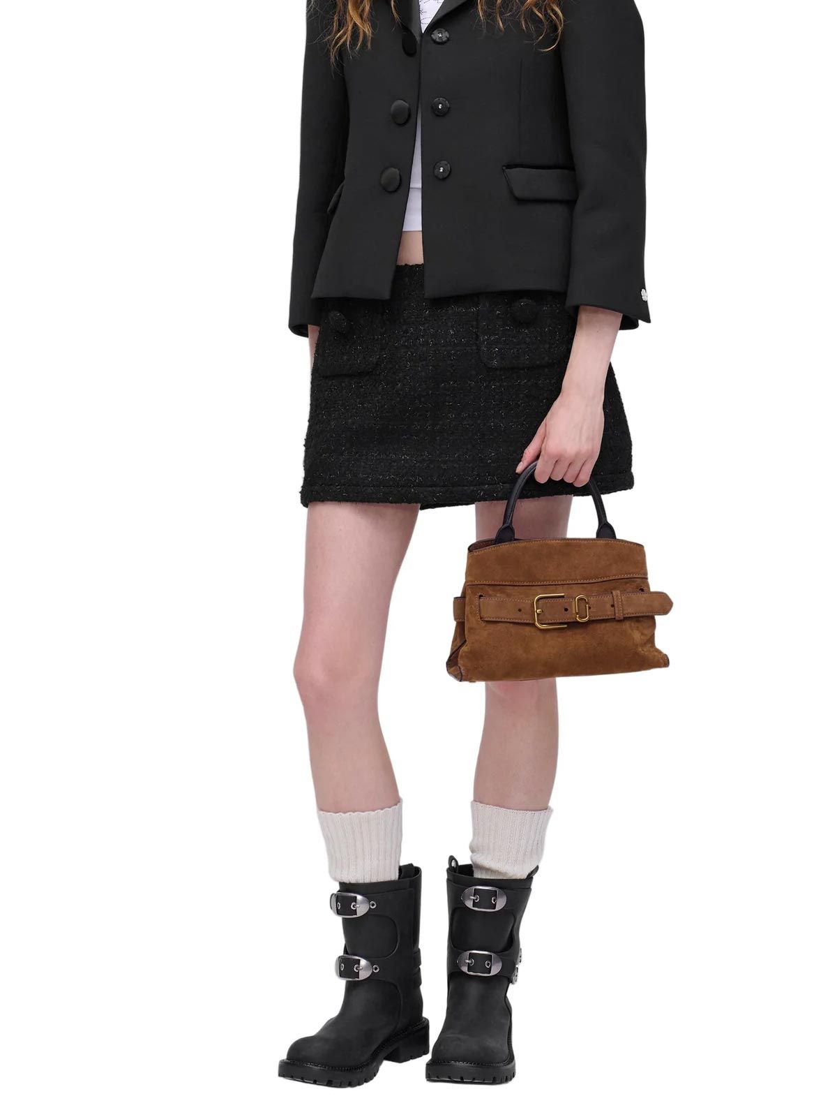 A compact reinterpretation of our iconic Marc Jacobs Dakota Satchel brown. This smaller version retains all the elegance and sophistication of the original design, condensed into a more manageable and easy-to-carry silhouette. Crafted from suede leather with a refined finish, it is enhanced by a decorative belt featuring the J Marc emblem, a tribute to the brand’s archives that underscores its unique character. The magnetic closure ensures effortless practicality, while the interior includes a zip pocket to keep essentials neatly organized. The structured leather top handle adds presence and definition.