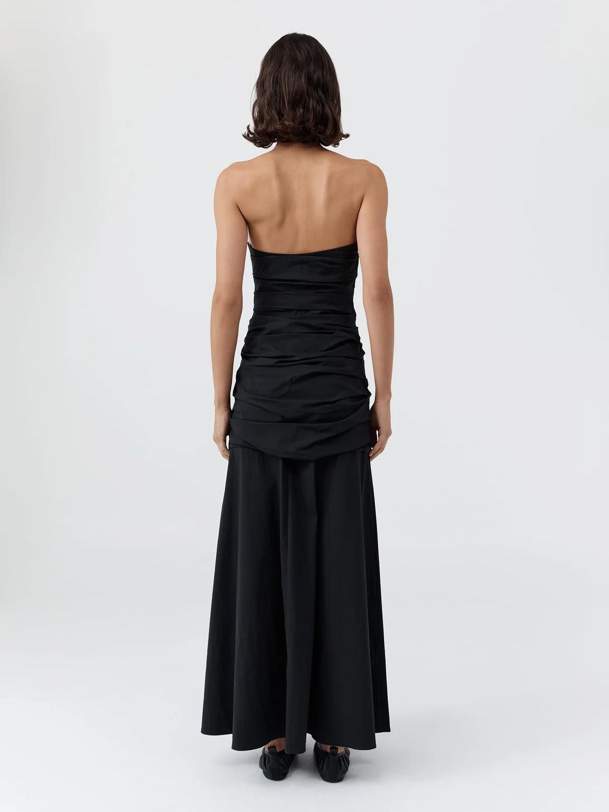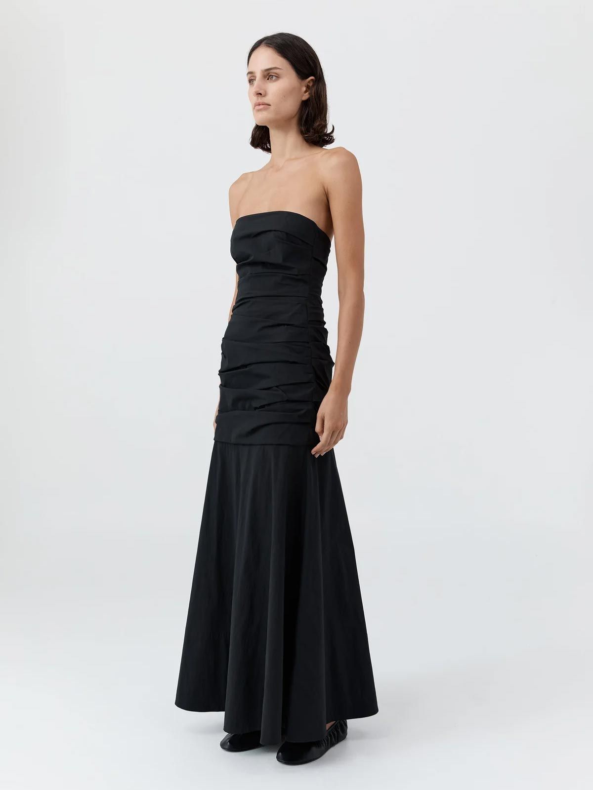 The distinctive feature lies in the fully shirred structure, designed to enhance the volume and movement of the fabric, harmoniously balancing structural sophistication with an incredibly fluid fit. The St. Agni black strapless maxi dress is the perfect dress for a special occasion, guaranteeing style and lightness with every step.