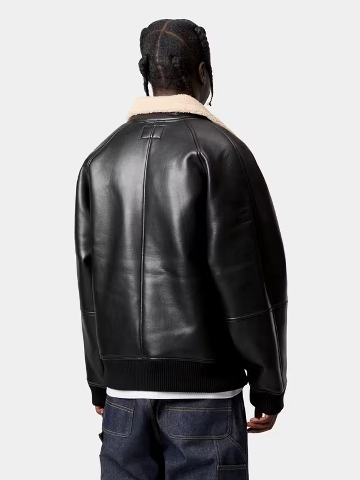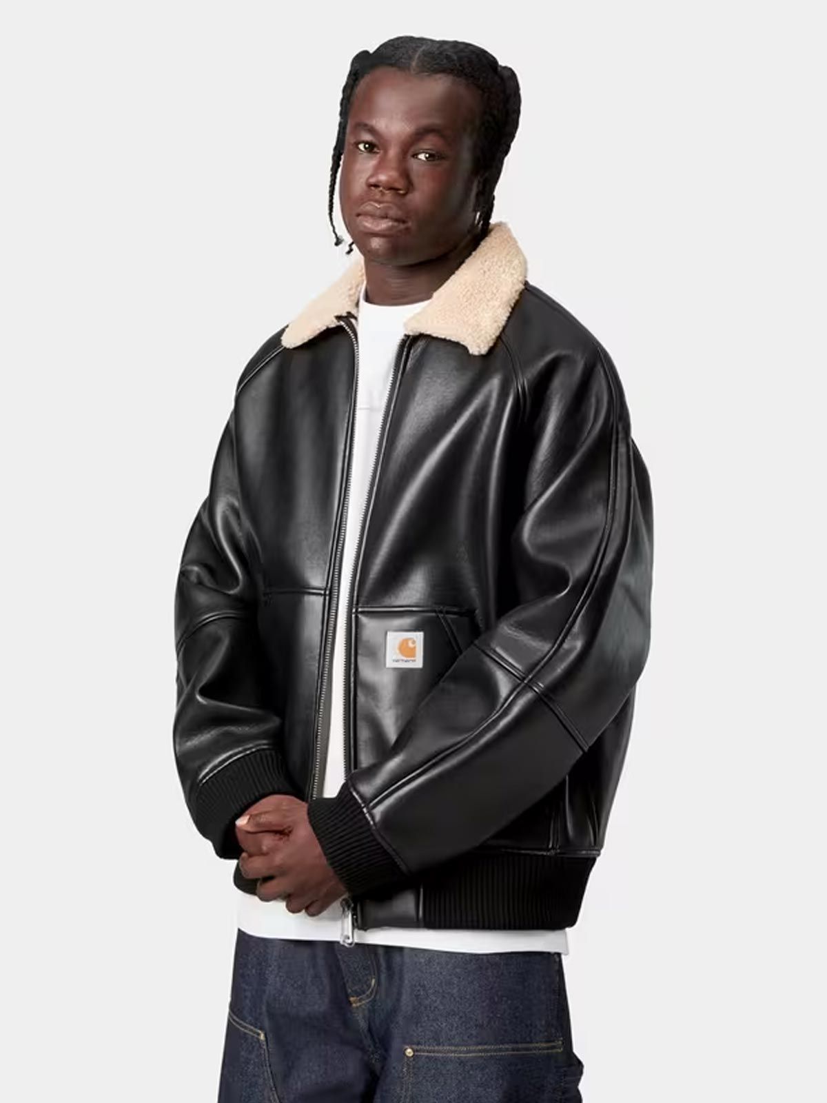 The Carhartt Shepton black jacket is made from soft, structured synthetic leather, enhanced by a warm faux fur collar and a coordinated lining that ensures comfort on colder days. The double-slider zipper closure offers versatility, while the rib-knit cuffs guarantee a snug, protective fit. A practical kangaroo pocket adds functionality to the design, completed by a characteristic woven square label that signs the look with a distinctive detail.