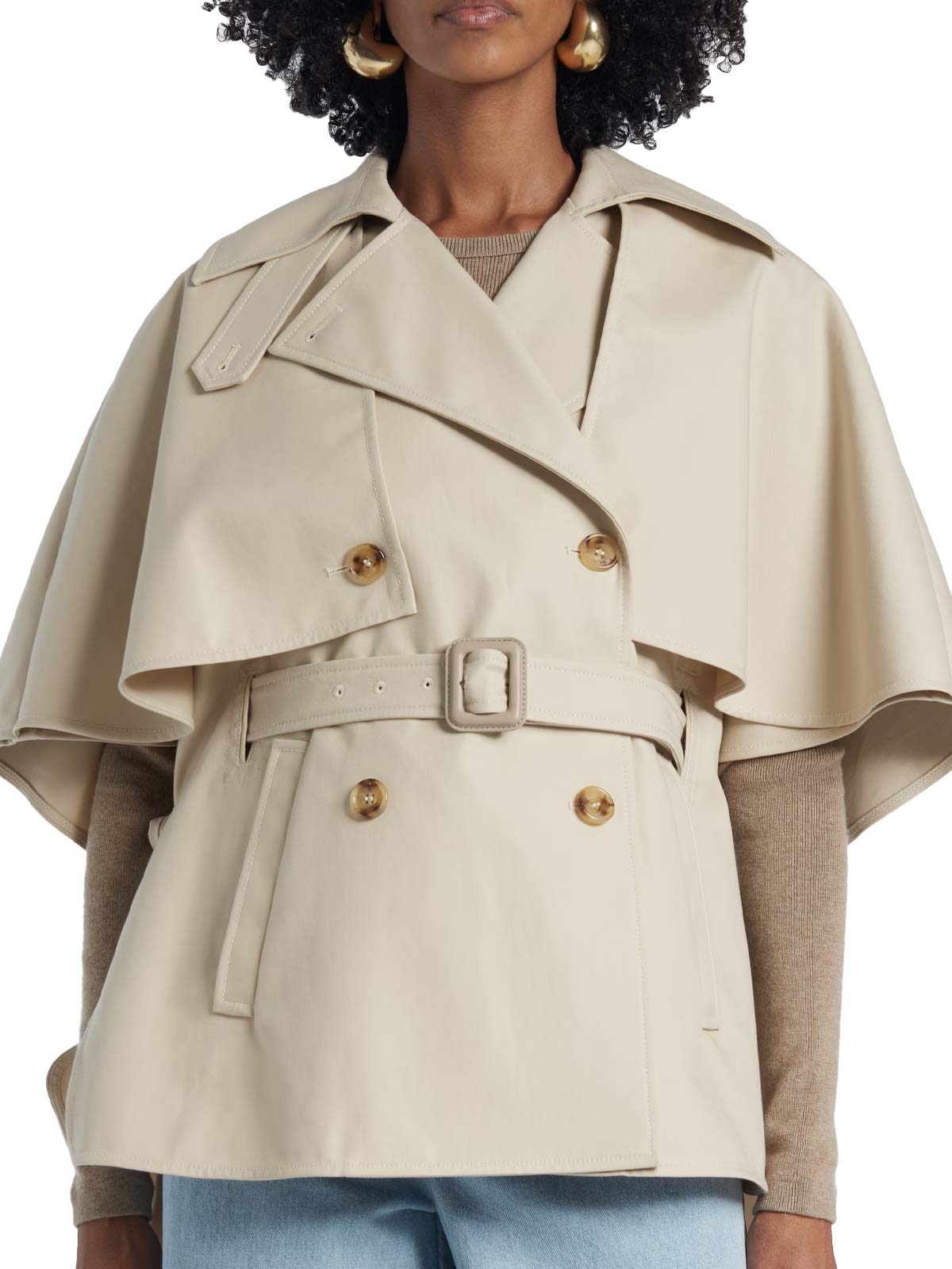 The dual-use lapel collar, with zigzag stitching on the undercollar, allows you to adapt the look for any occasion. Details like the short sleeves, the bavolet, and the double-breasted button closure give it a sophisticated allure. Practical welt pockets on the sides and a waist belt, with a leather buckle and embroidered eyelets, complete the Max Mara neutral waterproof jacket, ensuring a defined silhouette and impeccable functionality.