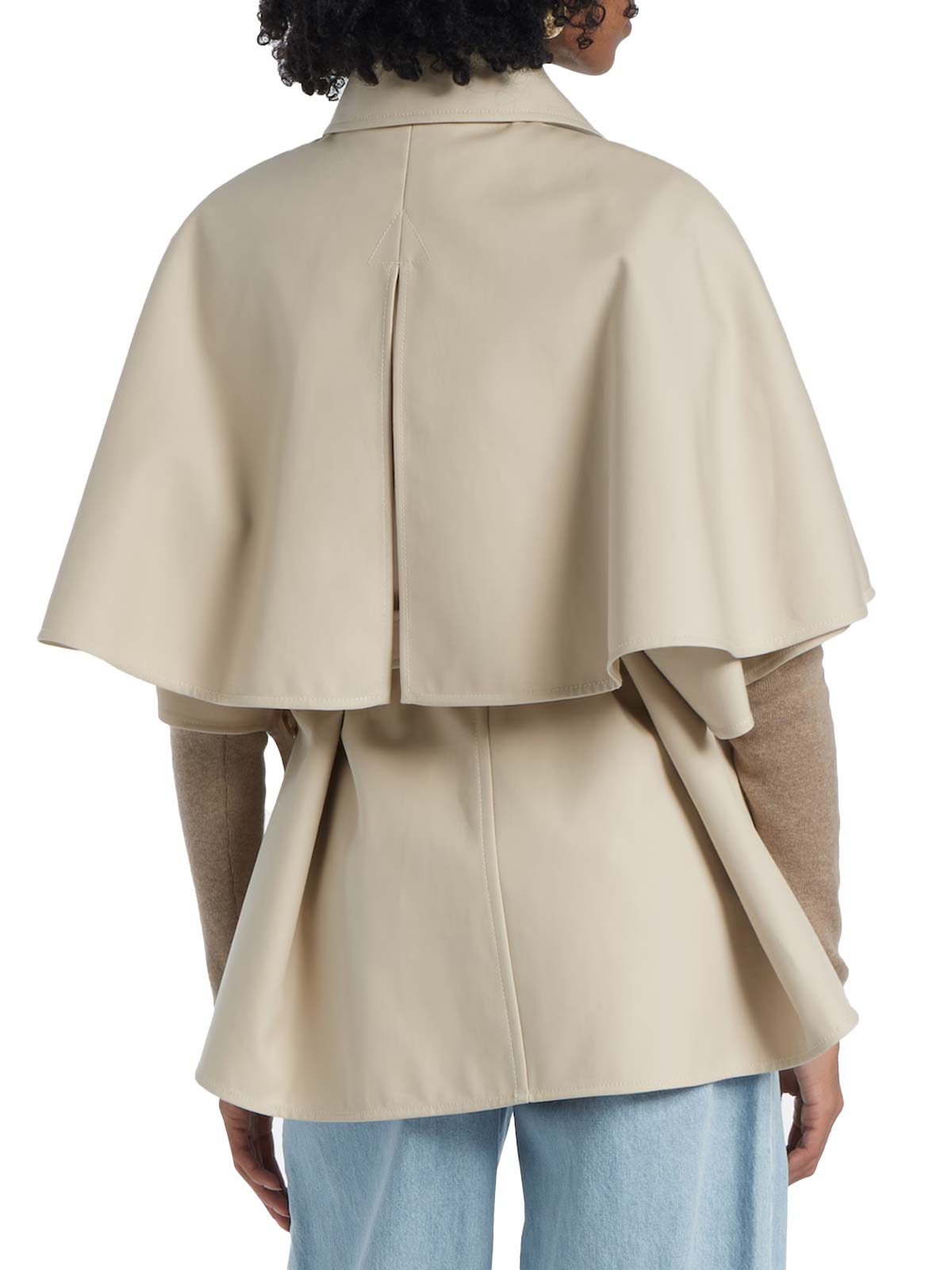 Discover the essence of effortless elegance with this Max Mara neutral waterproof jacket, a versatile piece that reinvents the classic trench coat. Crafted from double-faced pure water-repellent cotton gabardine, it offers a straight and comfortable fit, perfect for days on the go. The design stands out with a wide cape that covers the shoulders and back, adding a touch of mystery and movement, complemented by a stylish slit at the back.