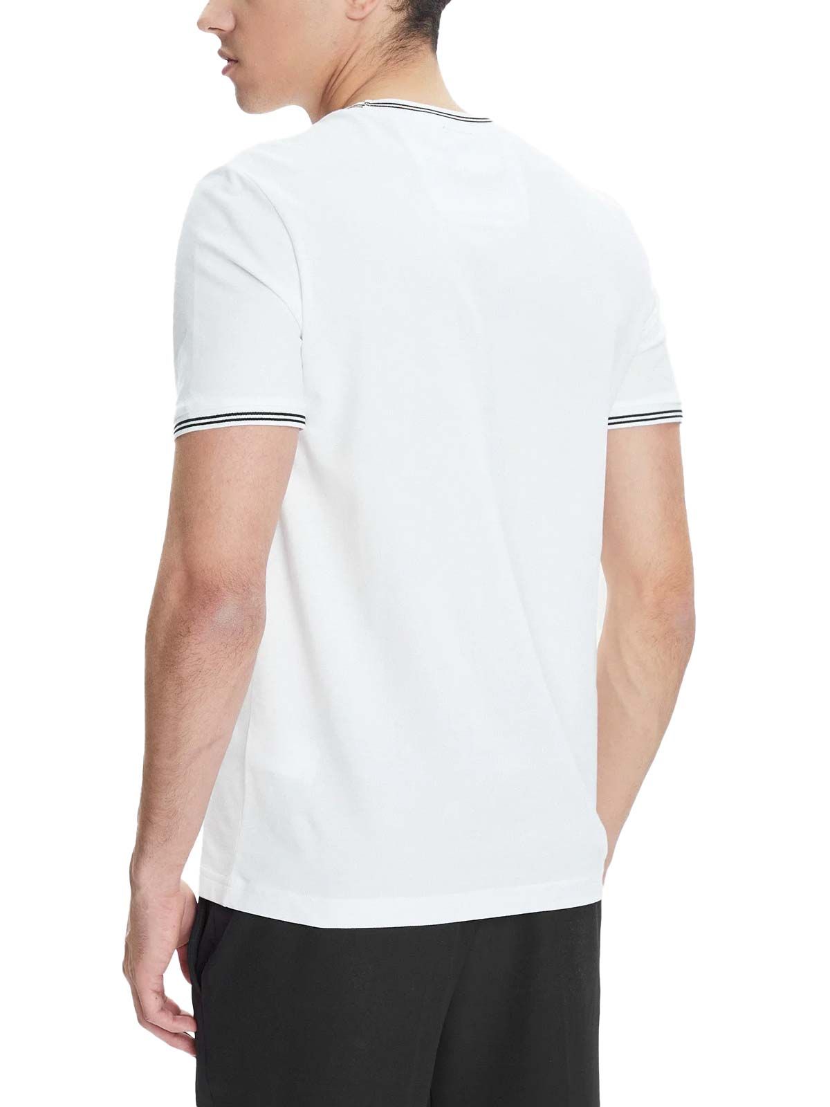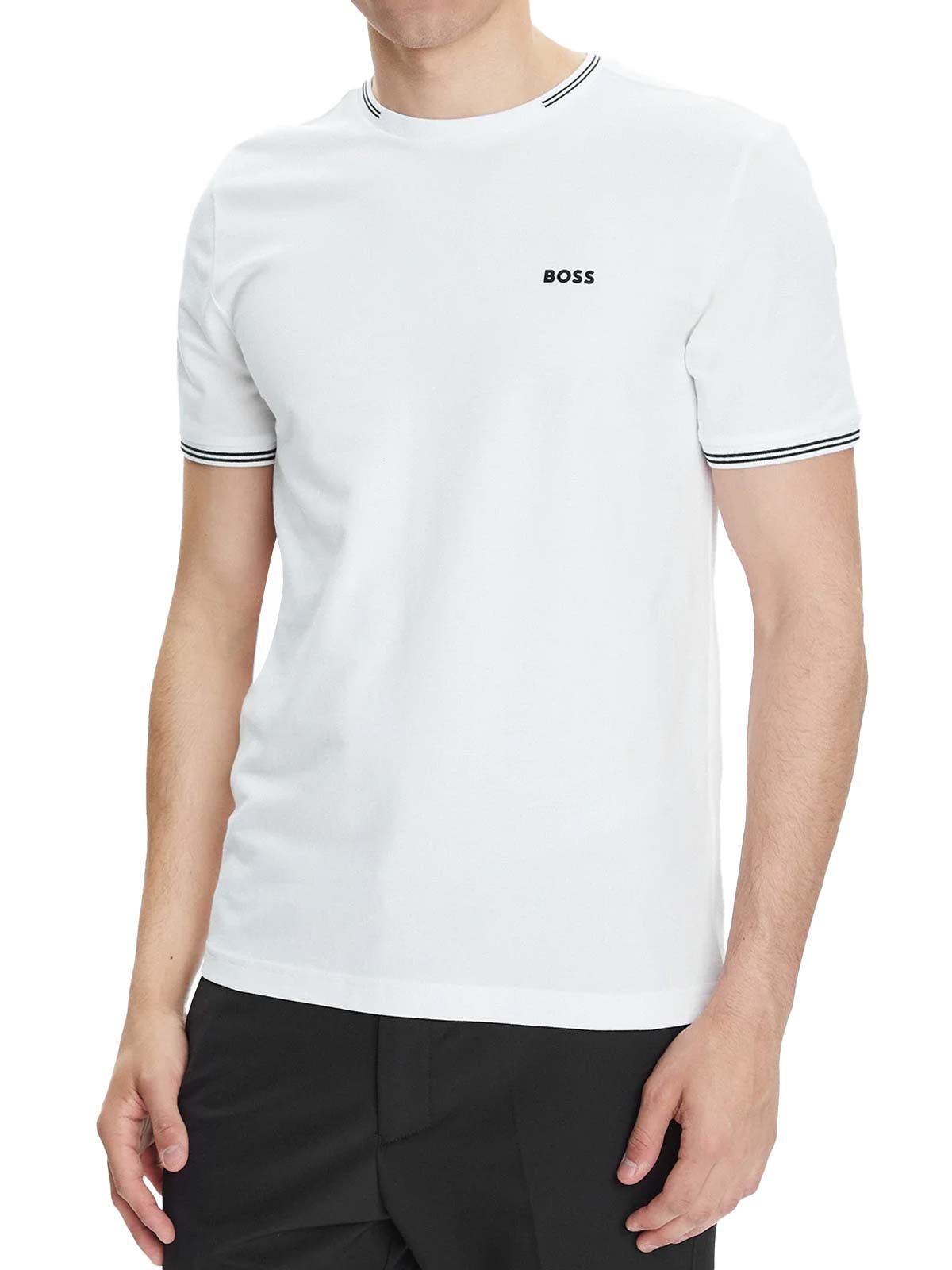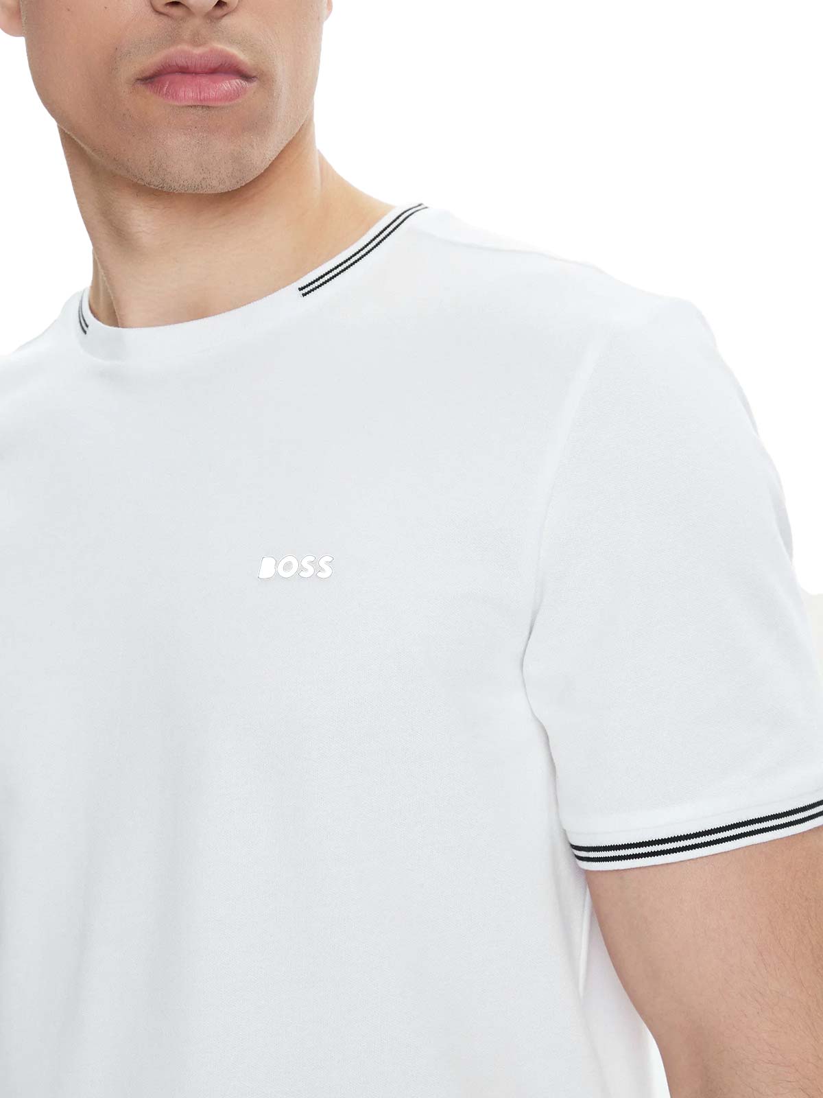 Refresh your wardrobe with this Hugo BOSS white men's T-shirt featuring a regular fit, a versatile and comfortable garment. Crafted from soft stretch-cotton piqué, it ensures a pleasant feel against the skin and excellent freedom of movement. The design of this short-sleeved top is enhanced by contrast stripes and a logo, details that add a touch of dynamism and contemporary style.