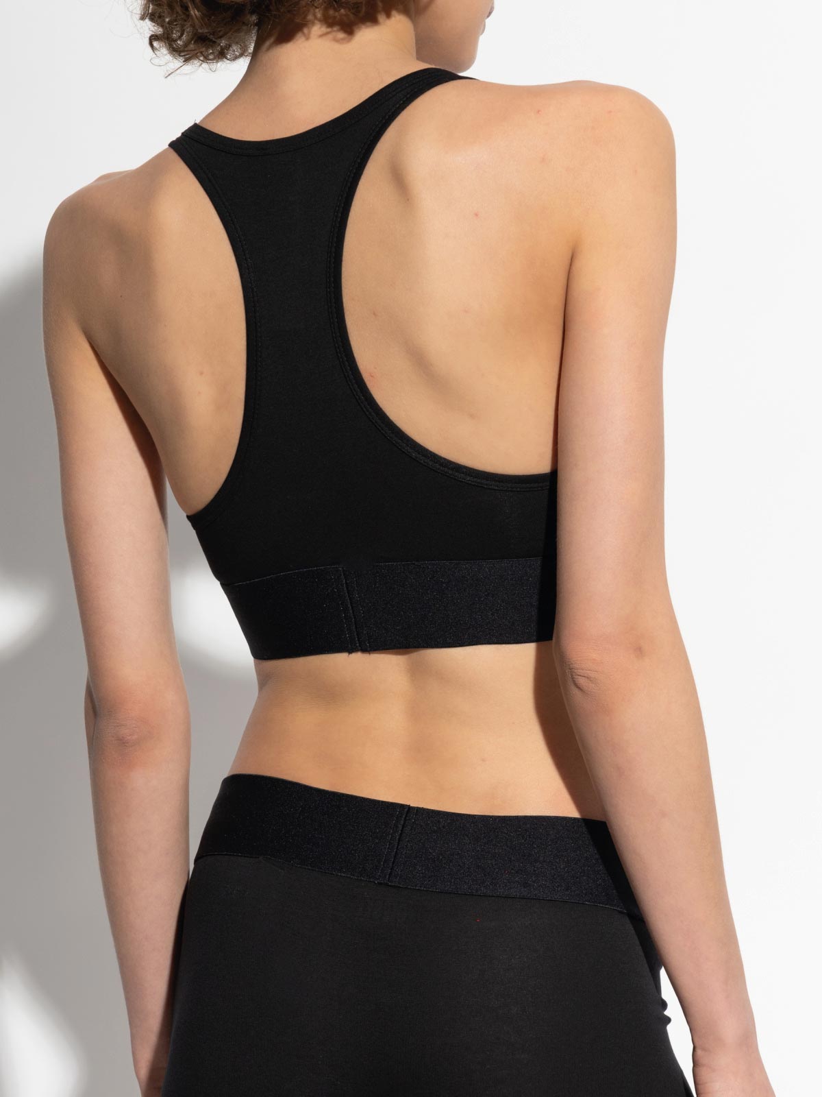 The racerback silhouette is not just a dynamic design detail but also ensures superior stability during exercises. The distinguishing feature of this Diesel black sports bra is the high jacquard band under the bust, which showcases an ironic, "cut-out" interpretation of the logo, elevating this functional garment to a true statement piece of current trend.