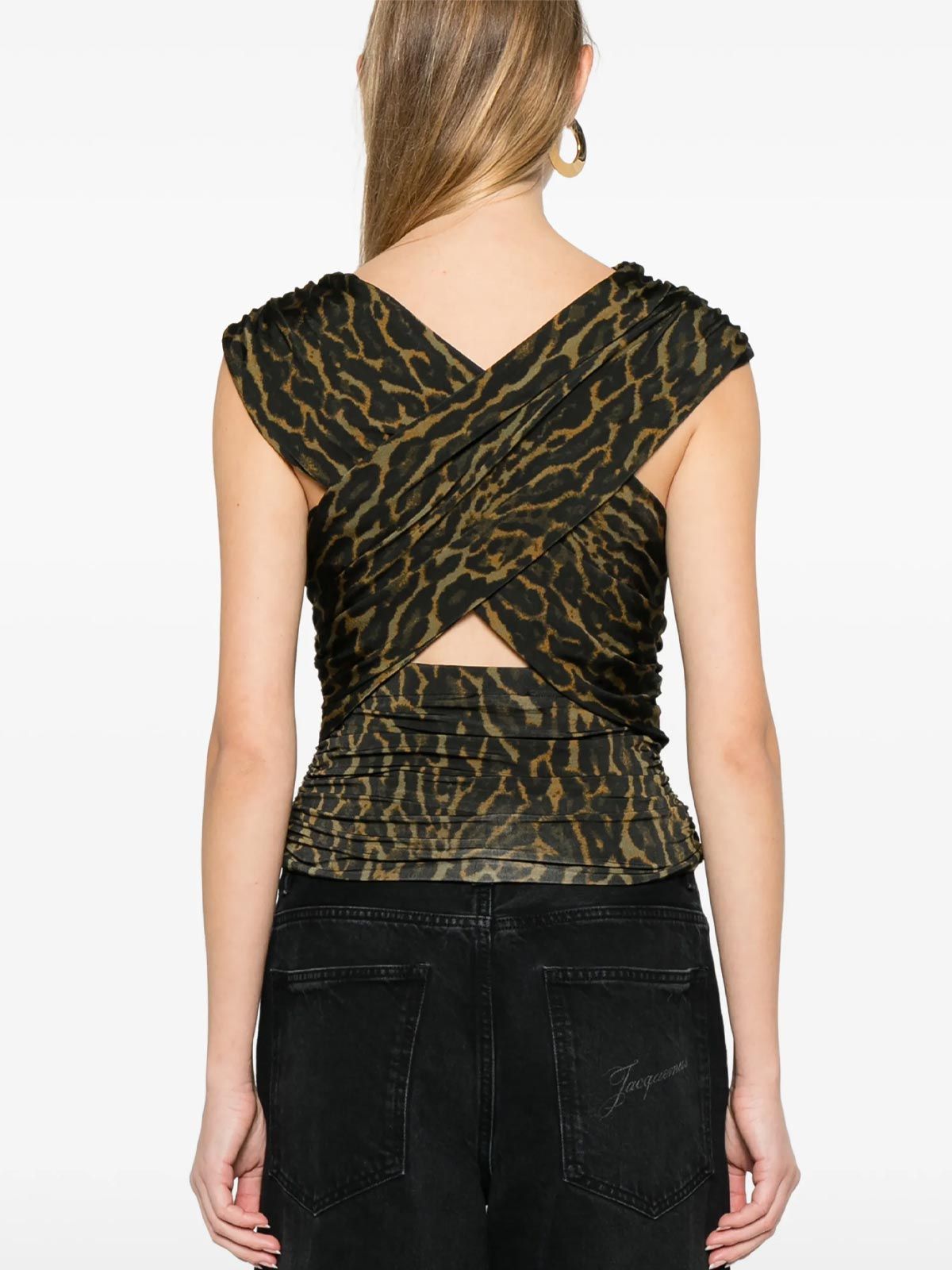 The glossy leopard-print trapeze top by Ganni is the statement piece you’ve been looking for. Made from stretchy, shimmering jersey, it features strategically placed ruching that sculpts the figure and ensures a flawless fit.