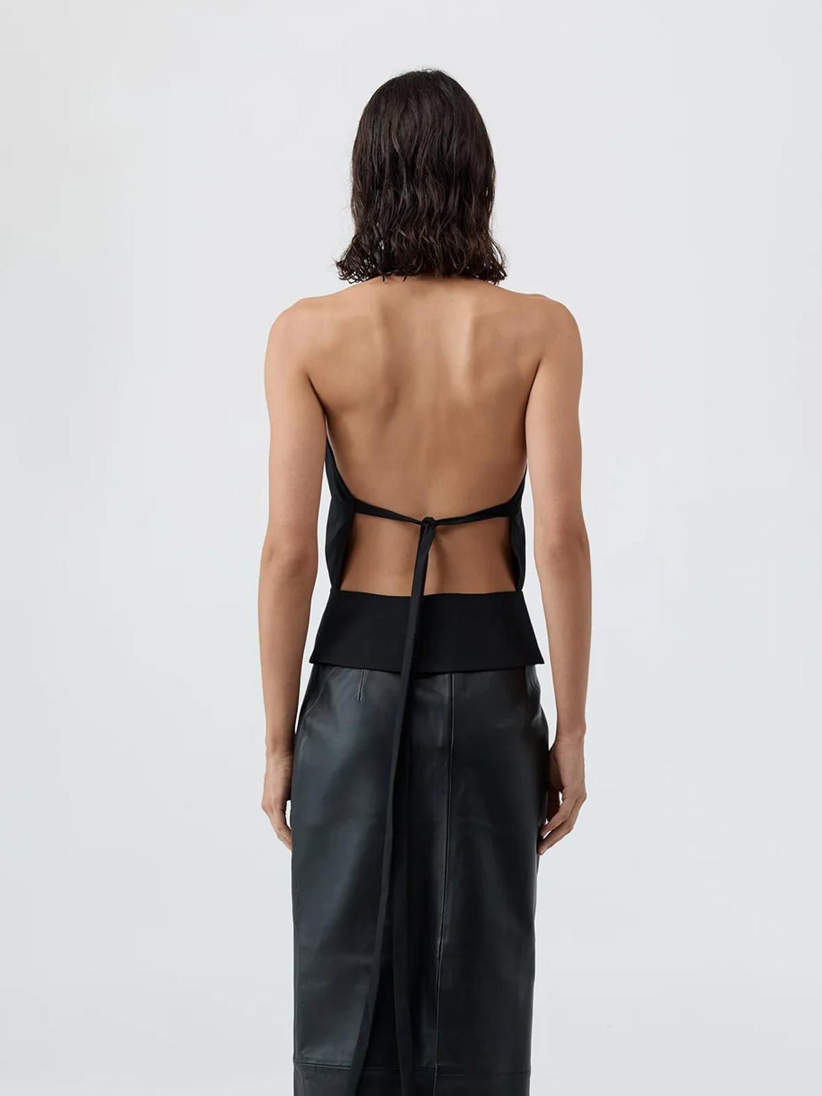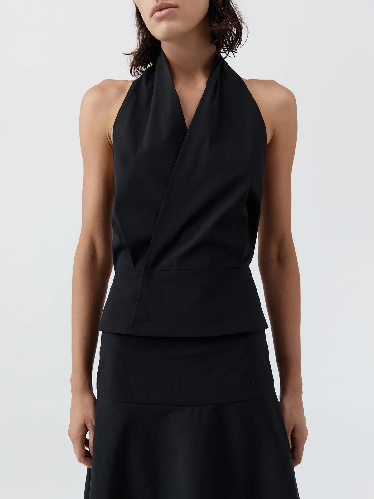 Perfect for warmer days, the St Agni Black Halter Top combines lightness and style in a versatile, sophisticated piece. Made from a breathable fabric blending cotton and recycled nylon, it features a form-fitting, flattering silhouette. The design includes a hidden snap-button closure at the front and an elegant tie at the back, leaving the shoulders and back exposed for a modern, feminine look.