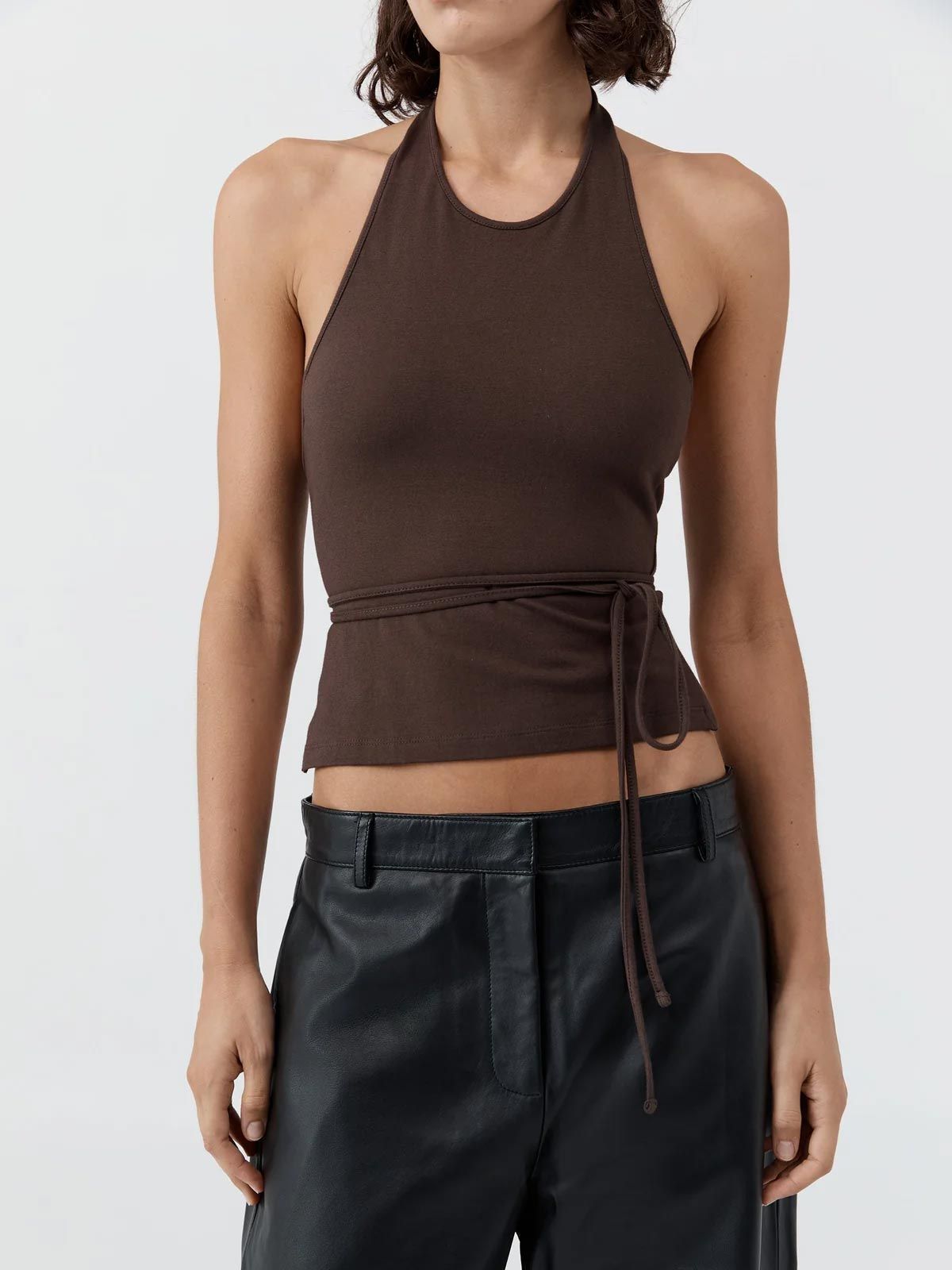 The garment stands out for its fully open back and the innovative tie-up fastening, which not only adds a refined detail but also allows for a completely adjustable fit. The St. Agni Liquor Halter Top establishes itself as a true wardrobe essential, ideal for styling in countless ways.