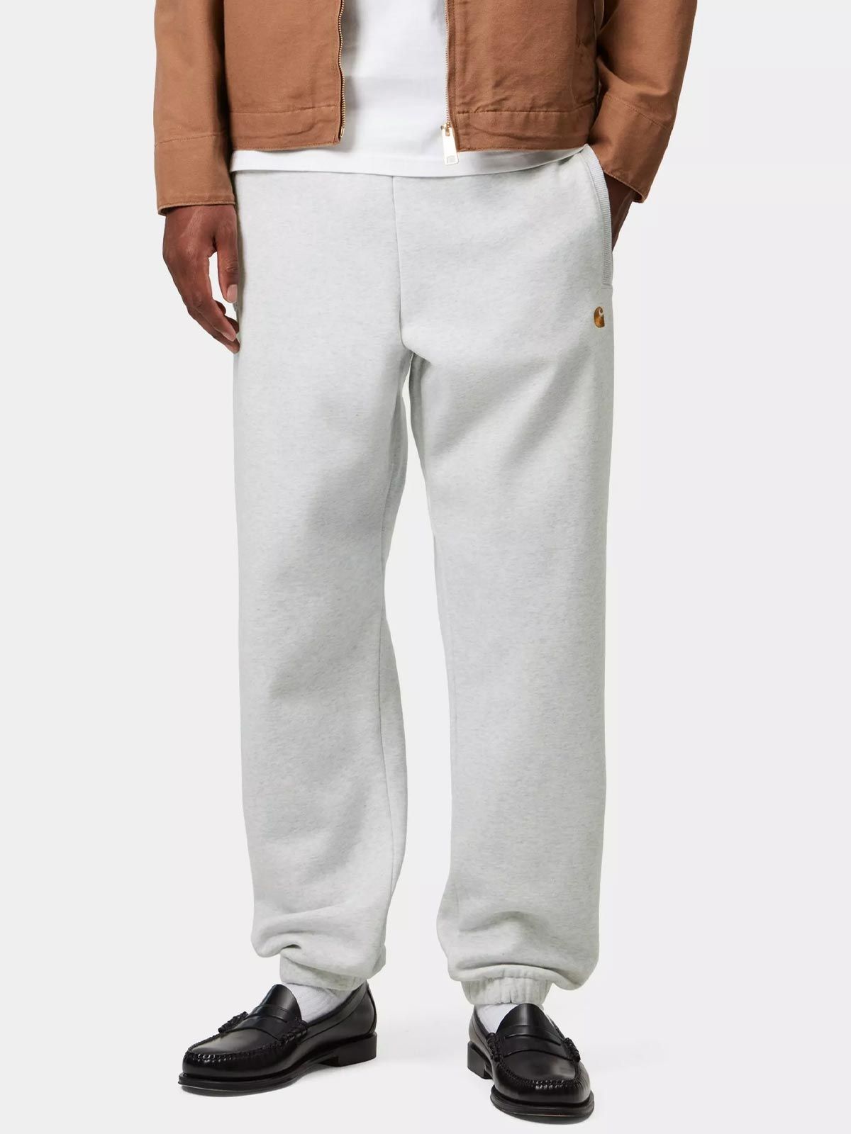 The Carhartt Chase Sweat pants in grey are loose-fitting sweatpants made from heavyweight brushed poly-cotton jersey, offering extra comfort and a soft, fleecy feel. Featuring an elastic waistband and leg openings, the Carhartt Chase Sweat grey pants provide a customizable, easy fit. The design is completed with a front “C” logo embroidery, adding a distinctive, contemporary detail to a piece perfect for everyday wear or relaxed moments.