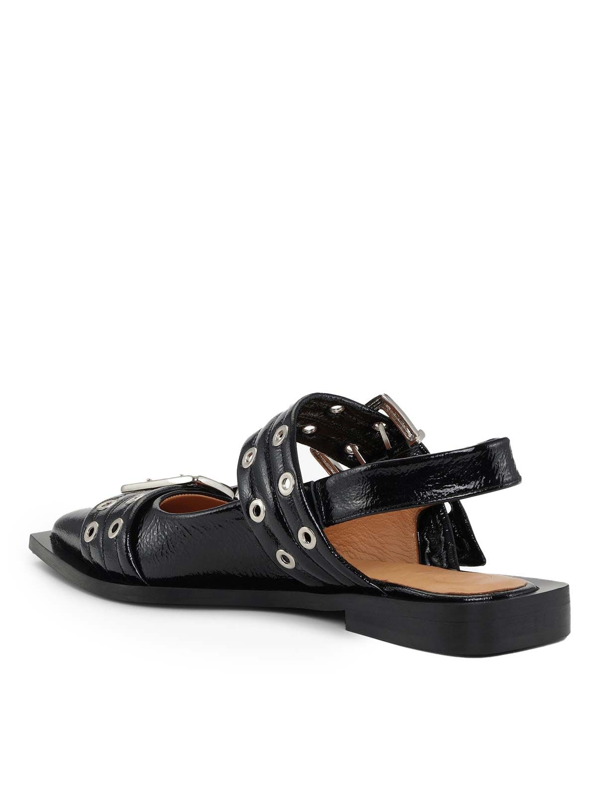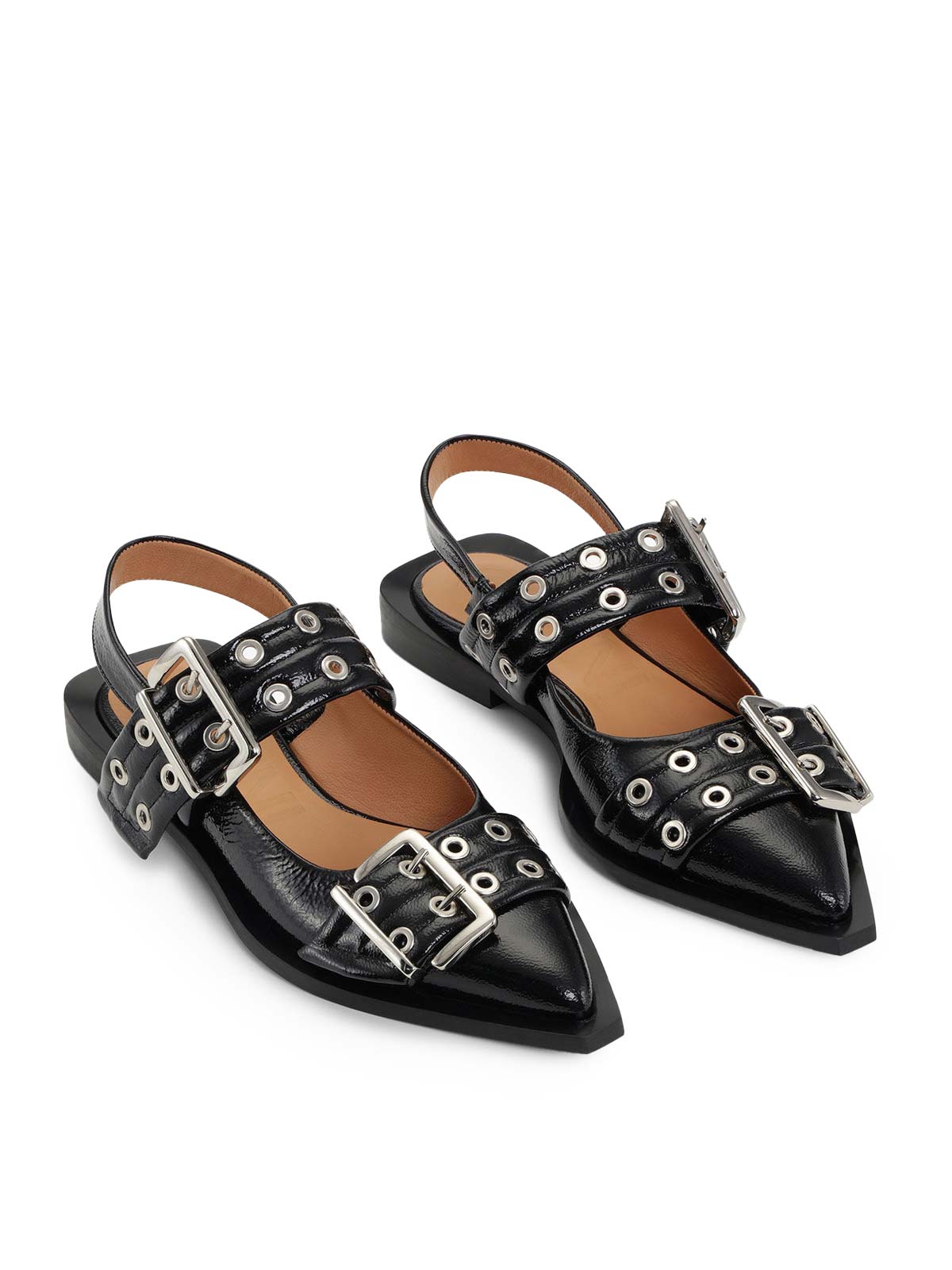 Rediscover a versatile essential: these black Ganni ballet flats with buckle are anything but ordinary. Crafted with a conscious blend that includes 51% recycled polyester, they stand out with their unique open-toe design. Silver-tone metal eyelets and elegant buckles add a touch of edgy sophistication, perfectly complementing the graceful tapered toe.