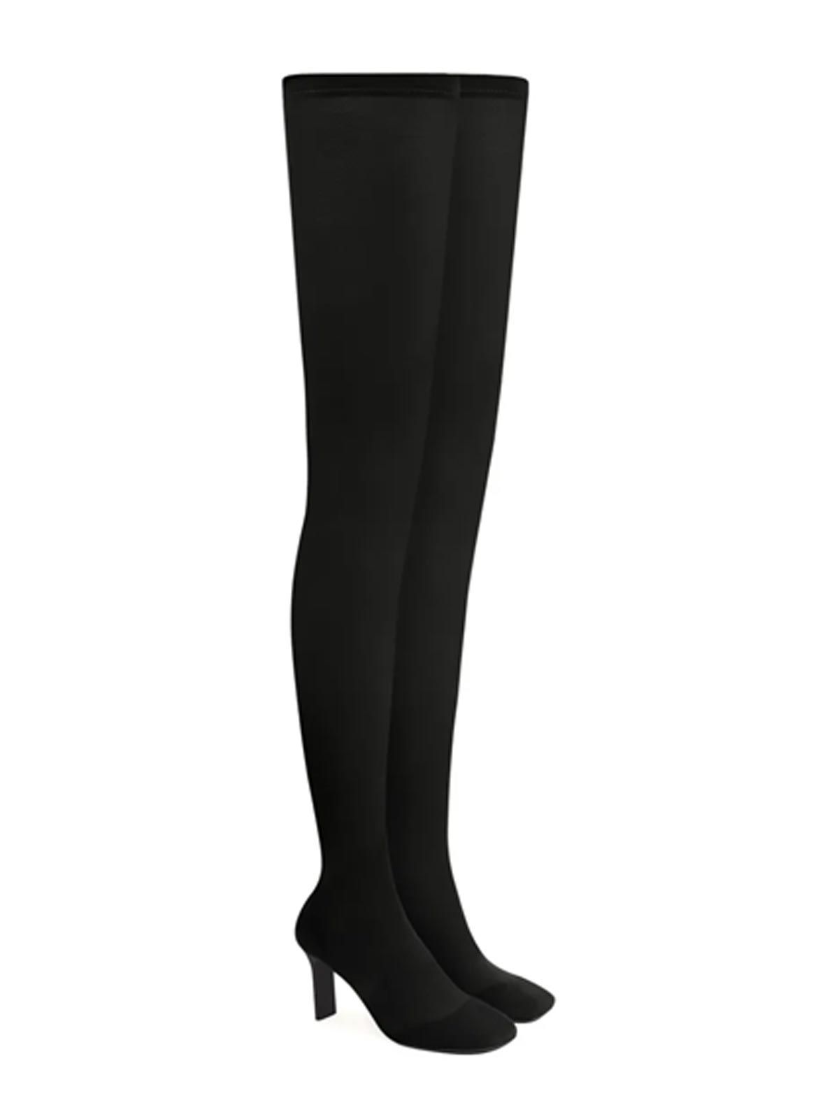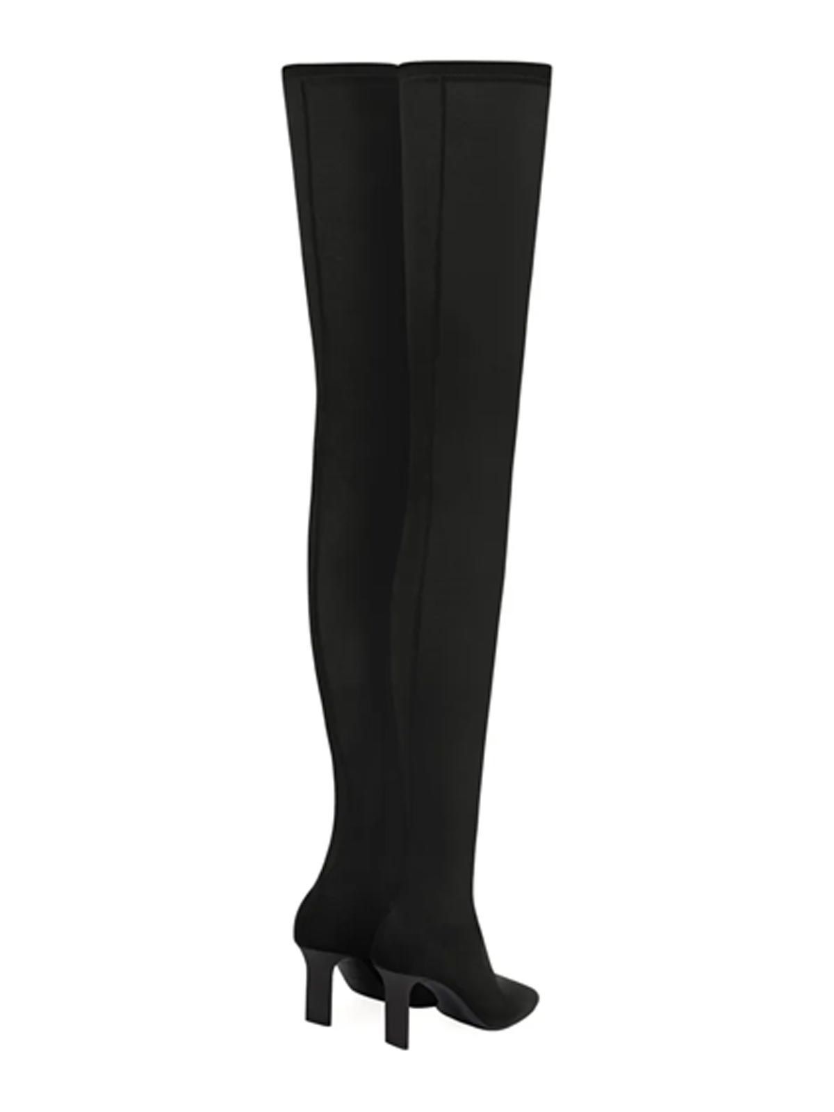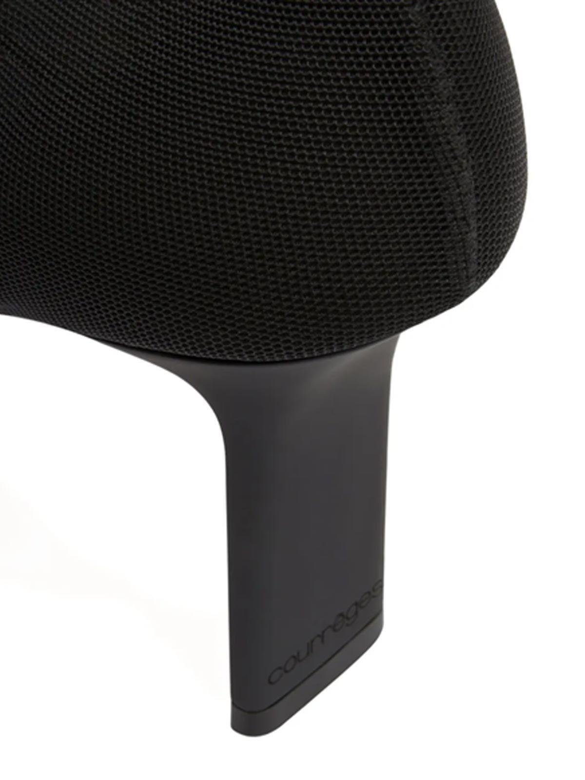 These ultra-high Courrèges square toe 80 black boots redefine the concept of footwear with a design that merges sensuality and structural avant-garde. Masterfully crafted in Italy, they are the expression of futuristic luxury. The silhouette boldly reaches thigh-high, made from an innovative mesh fabric in Black. This material not only hugs the leg like a second skin but gives the overall look a light and hyper-modern allure.