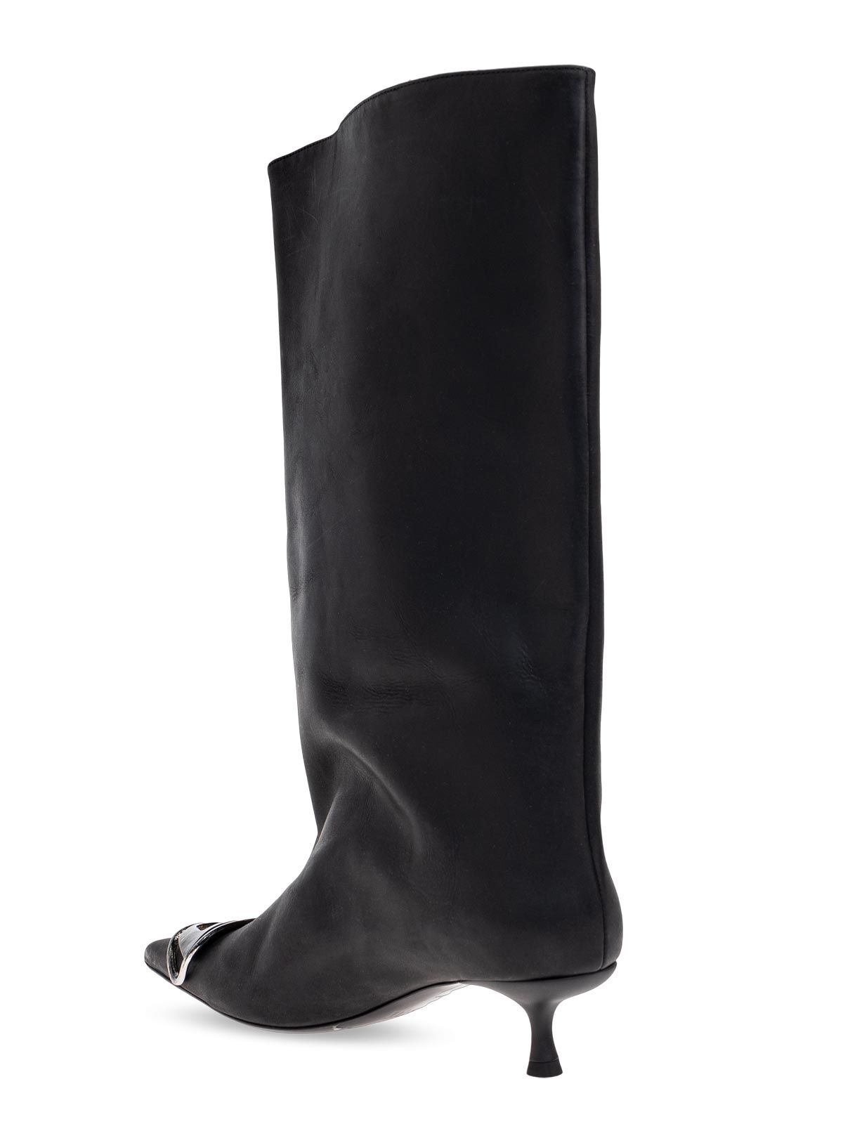 Step into the heart of fashion with these exclusive Diesel D-Venus 40 KB Tube black boots, straight from the Fall/Winter 2025 Runway. Produced in Italy, this style immediately captures attention thanks to its high-quality oiled leather with a distinctive "worn-in" finish, which enhances its character. The design expertly combines a wide, statement shaft and a super-feminine tapered toe, balanced by a 4 cm kitten heel that provides lift without sacrificing comfort.
