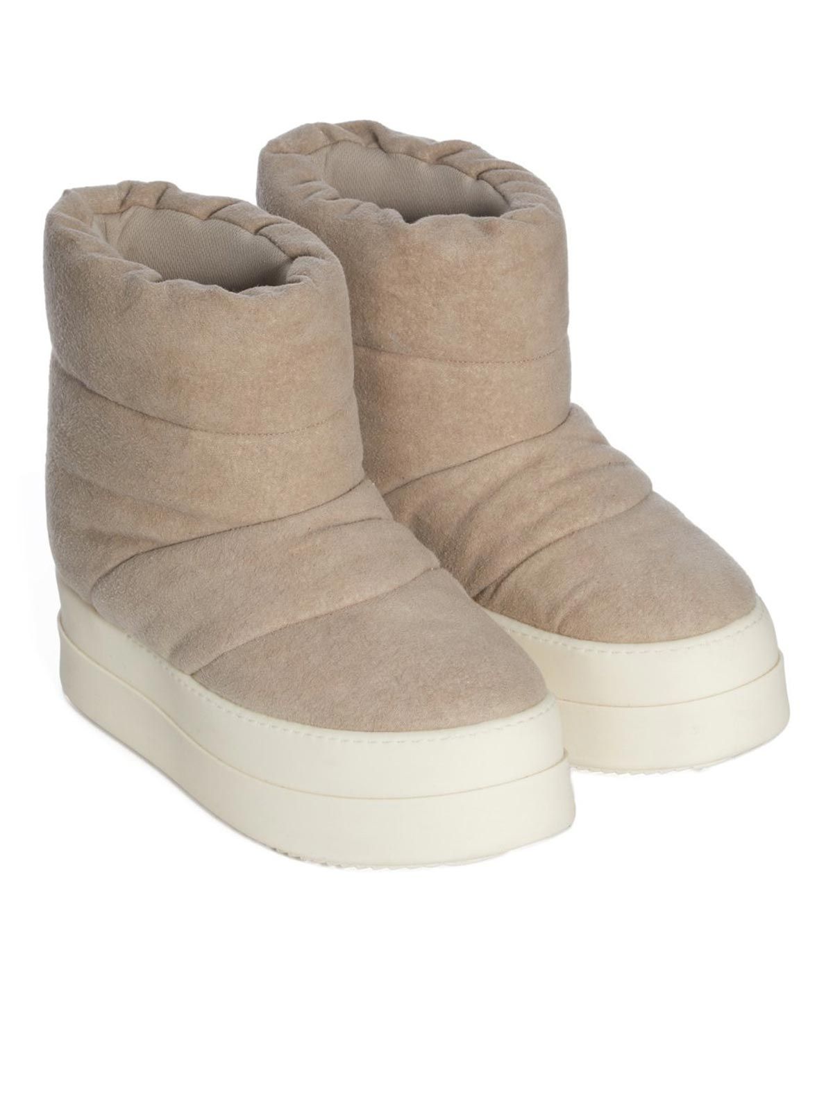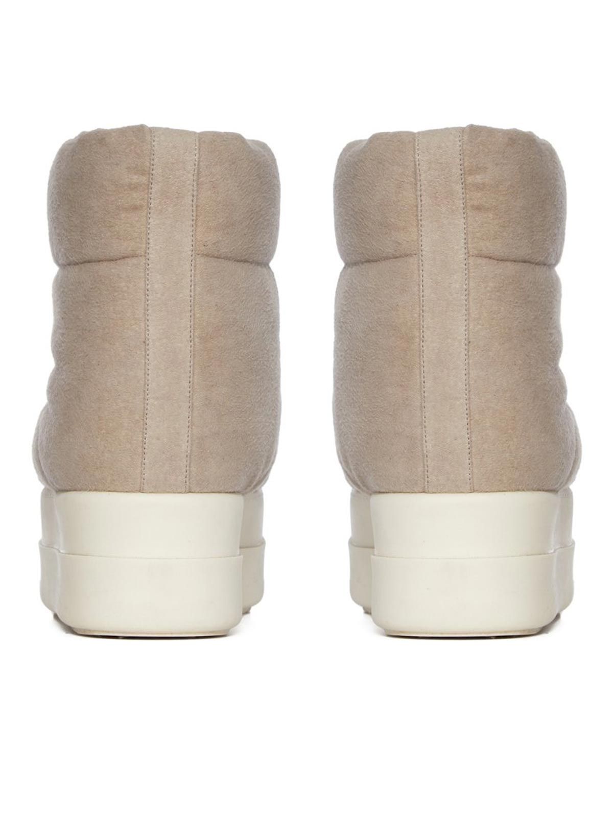 This is not a sneaker, it's architecture to wear. The Rick Owens DRKSHDW Mega Bumper low Lunar boots in Dirty Pearl/Milk elevate the concept of footwear to a post-apocalyptic sculpture. Rising high above the ankle and finished in an enigmatic, subdued color, they envelop the foot in dystopian luxury. The soft, padded upper is a canvas of medium-weight brushed cotton, subjected to artisanal garment dyeing that gives it a lived-in, unmistakable texture.