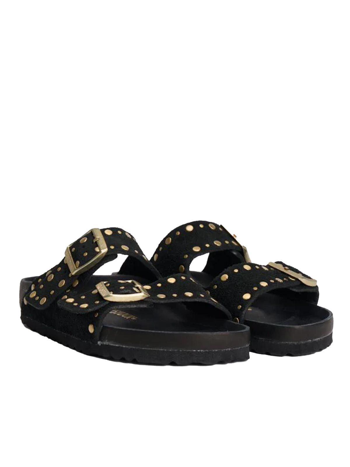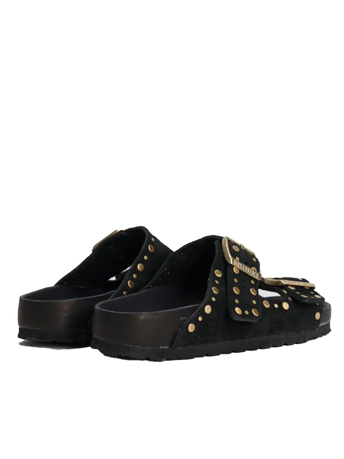 Elegance comes from the ultra-soft suede upper and the precisely applied metal rivets, designed without internal backings to maintain a clean finish and ensure an uninterrupted, comfortable fit. The black BIRKENSTOCK Arizona Rivet stands out as a refined essential, blending timeless design with sophisticated detailing for an elevated look and unmatched comfort.