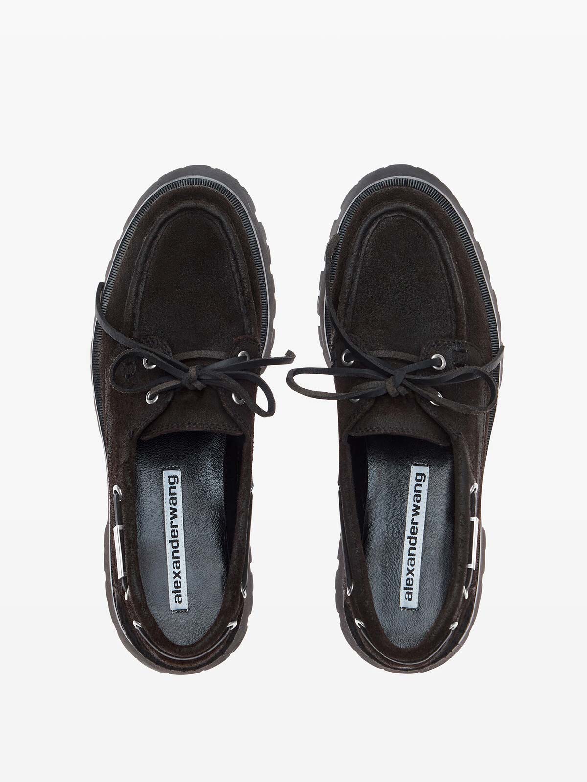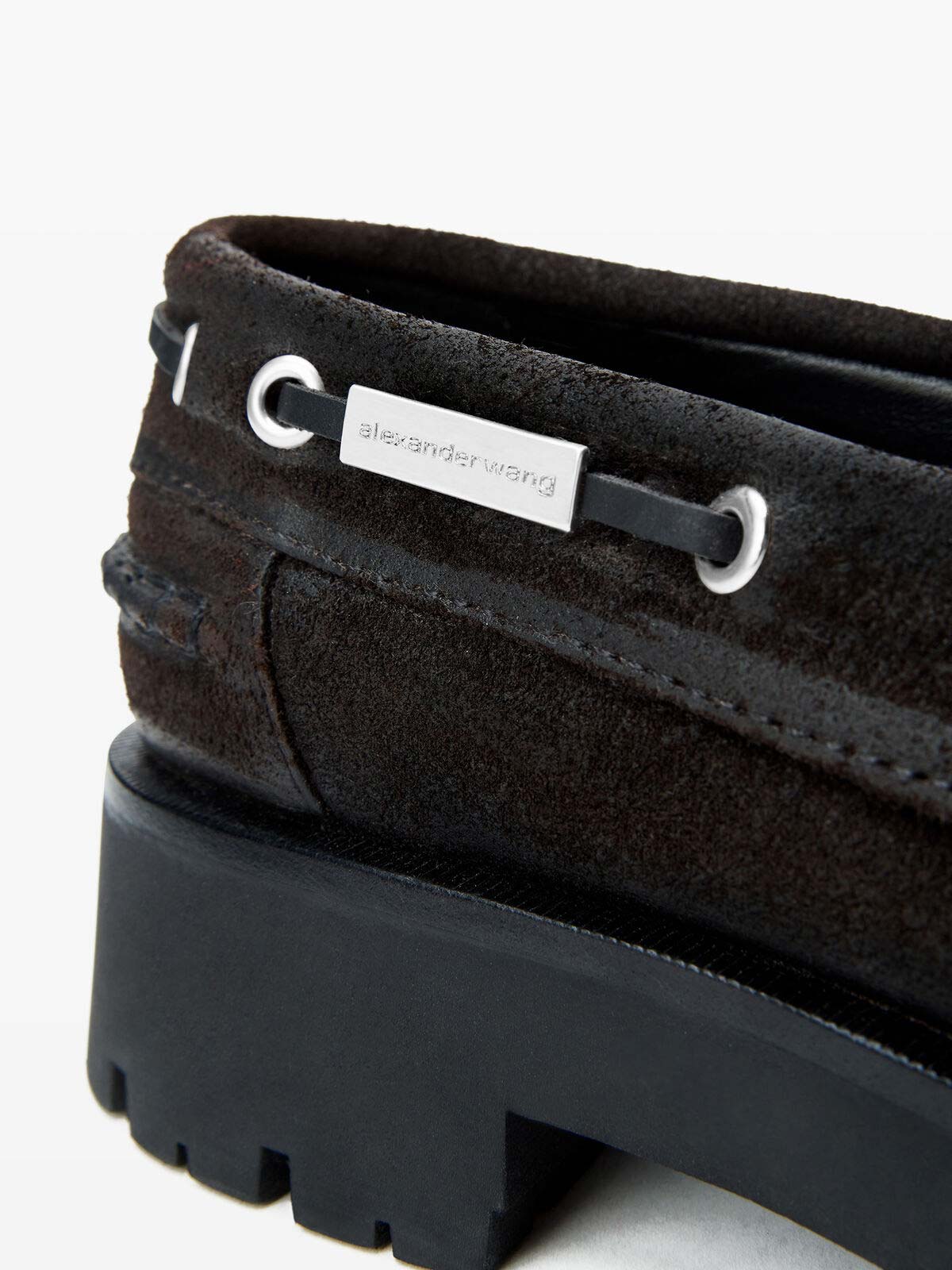 These brown Alexander Wang loafers elevate the concept of casual footwear, blending refined elegance with surprising robustness. Crafted from 100% premium suede, they promise superior quality and exceptional durability, designed to accompany you for years to come. The design features a tapered almond toe that adds a touch of sophistication, while the front closure with leather laces provides a classic and functional detail. The chunky rubber lug sole not only completes the look with a bold character but also ensures excellent traction and lasting comfort.