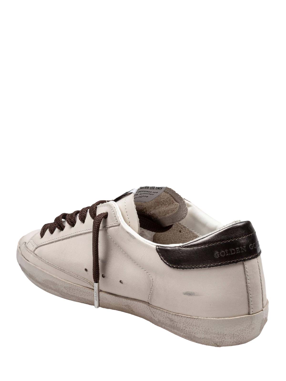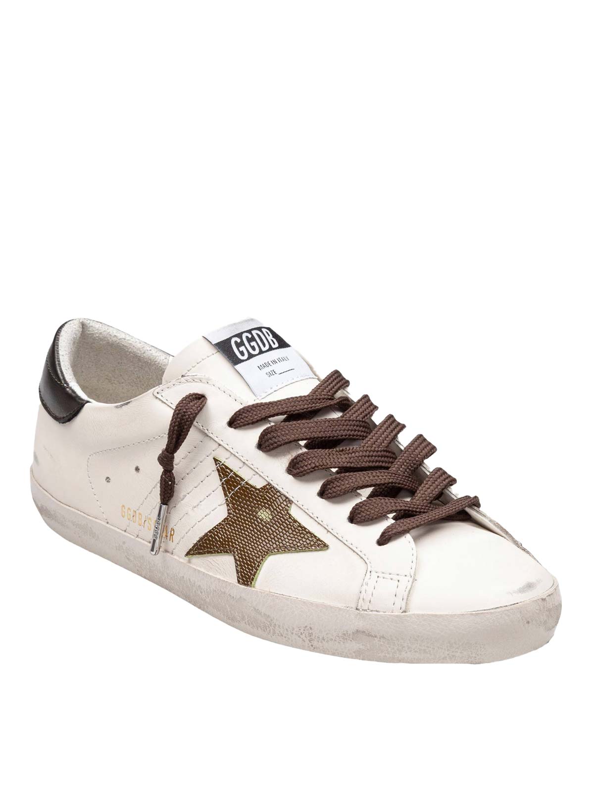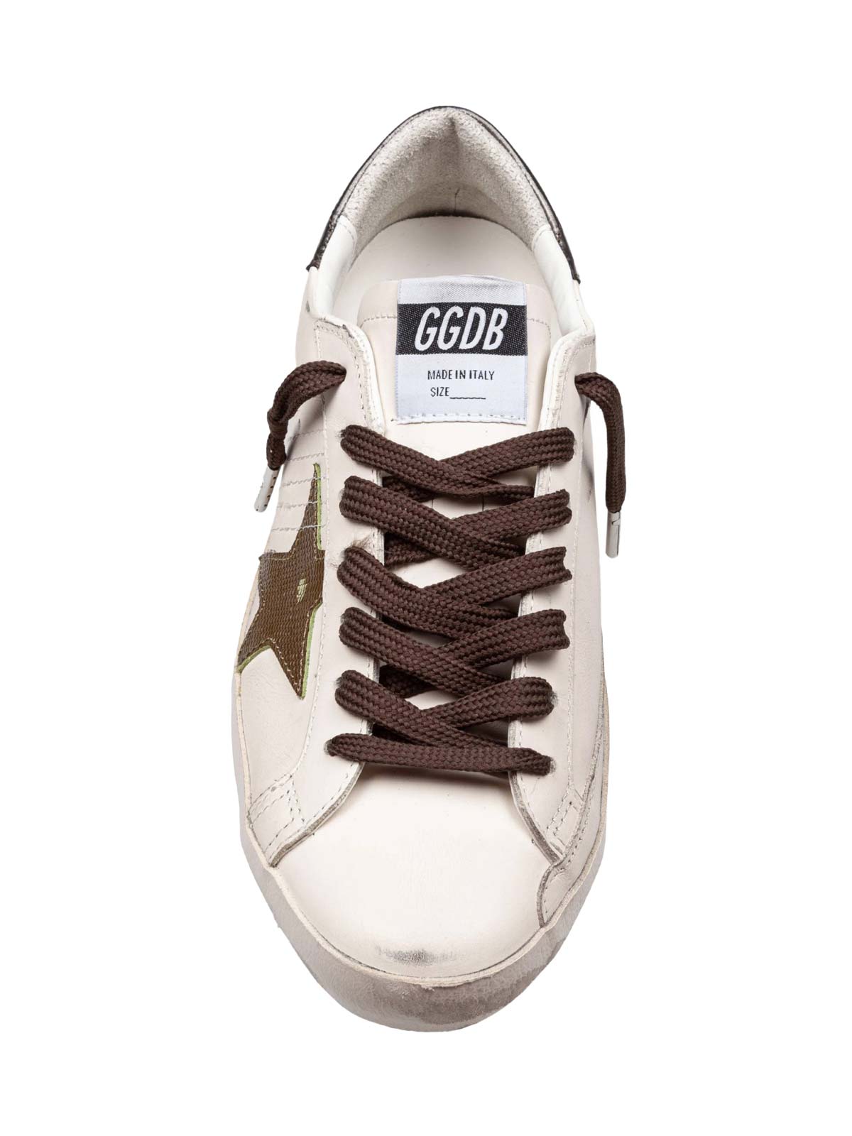 Elevate your style with the white and brown Golden Goose SuperStar sneakers, a model that combines a bold aesthetic with high-quality Italian craftsmanship. Characterized by a light-catching, contrasting silver heel tab, these shoes stand out with their iconic side star featuring an exclusive scaly texture. The laces, which match the color of the star, create a harmonious and distinctive look.