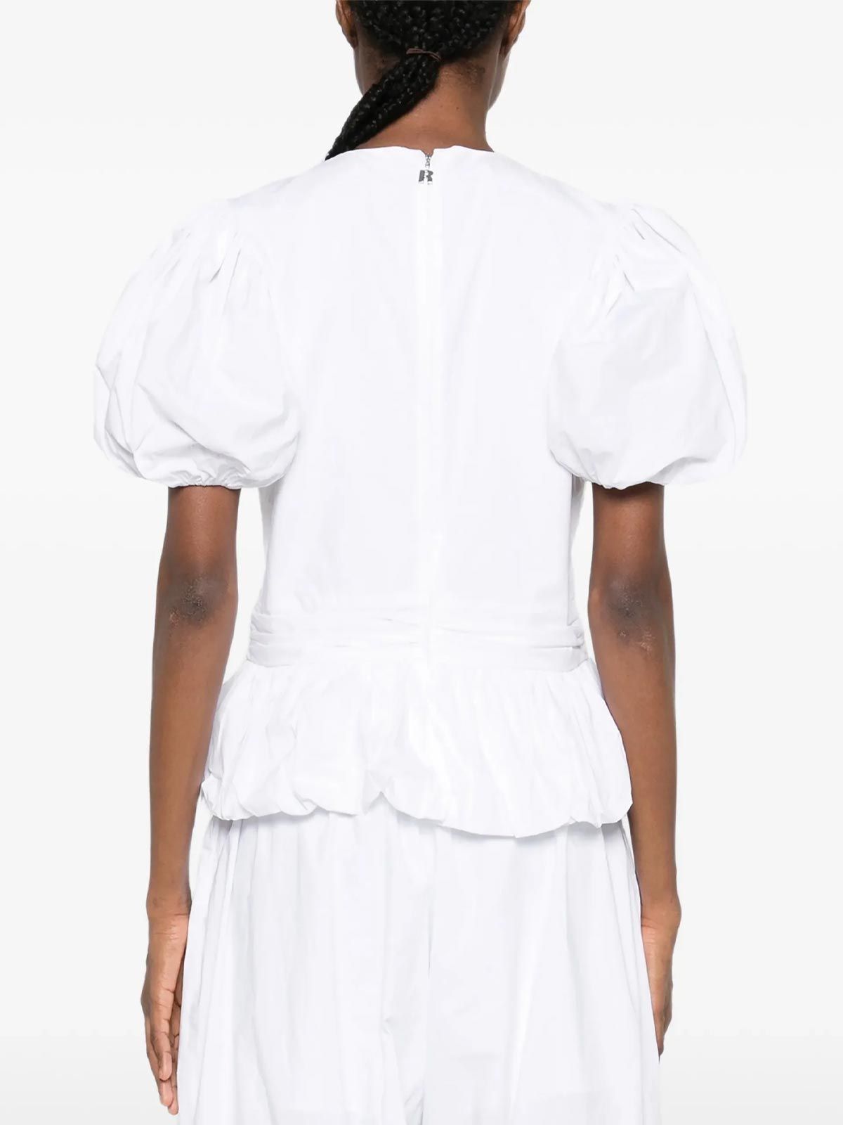 Questo top con maniche a sbuffo Rotate bianco è un capolavoro di purezza e design giocoso. Realizzato in 100% cotone biologico, unisce la morbidezza del tessuto a una silhouette statement. Il taglio dritto e il collo rotondo sono elevati dalle magnifiche maniche corte a sbuffo, che aggiungono volume e romanticismo. La finitura elasticizzata e la chiusura con cerniera sul retro assicurano una vestibilità perfetta, mentre il volant sull'orlo regala un finale dinamico e femminile.