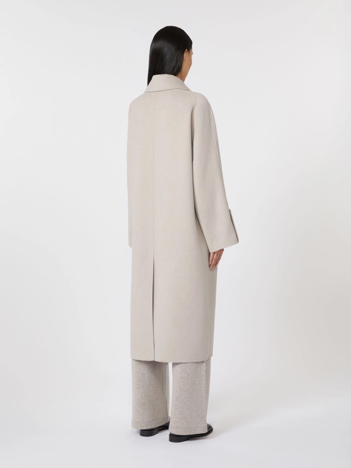 Il collo a camicia a doppio uso e la chiusura doppiopetto con bottoni a vista conferiscono un'estetica pulita e sofisticata. Tasche a filettone e spacco centrale posteriore completano questo cappotto in lana lungo Max Mara beige, un capo versatile, un vero capolavoro di sartoria artigianale.