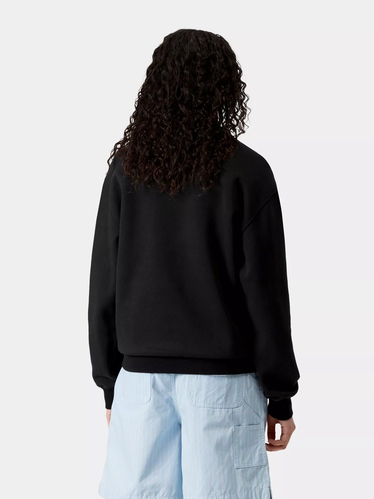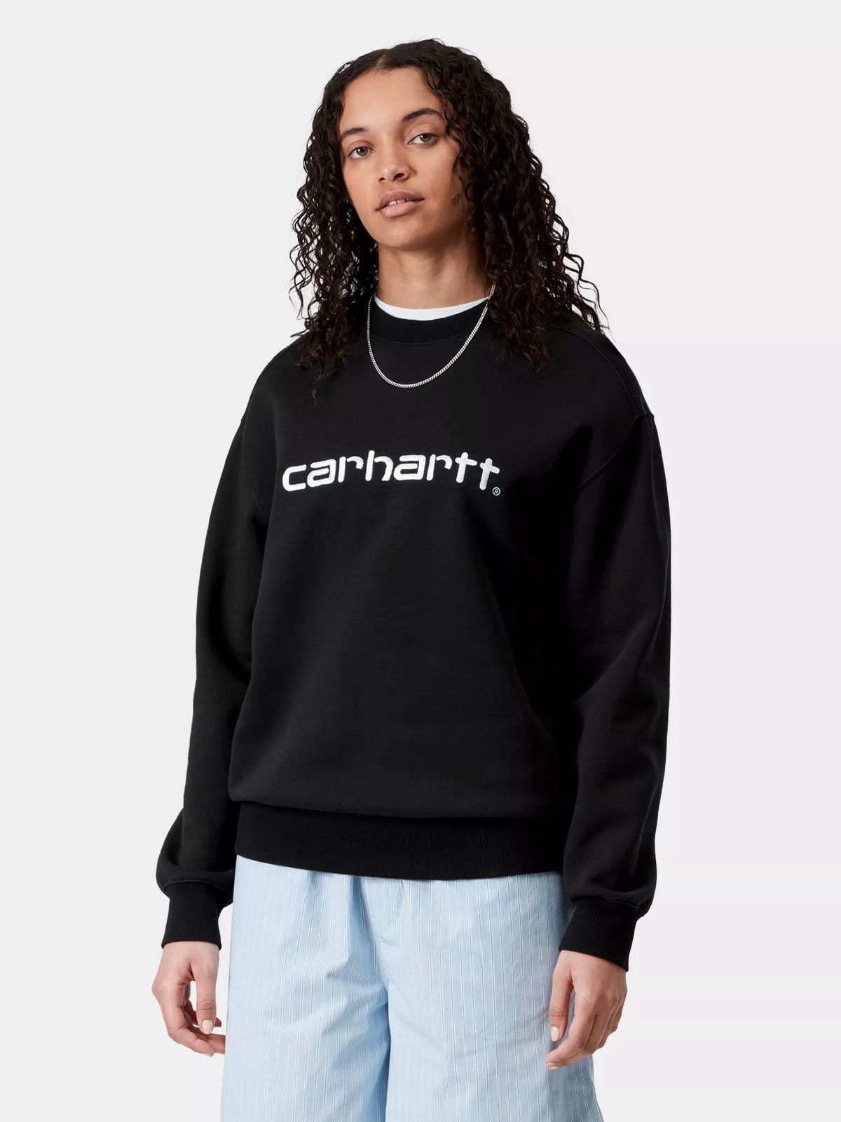 La felpa Carhartt da donna nera combina comfort e stile urbano in un capo essenziale. Realizzata in robusto jersey misto cotone-poliestere spazzolato, offre una morbidezza interna simile al feltro. Il taglio regolare garantisce una vestibilità comoda e versatile, mentre il logo ricamato sul petto aggiunge un tocco distintivo.