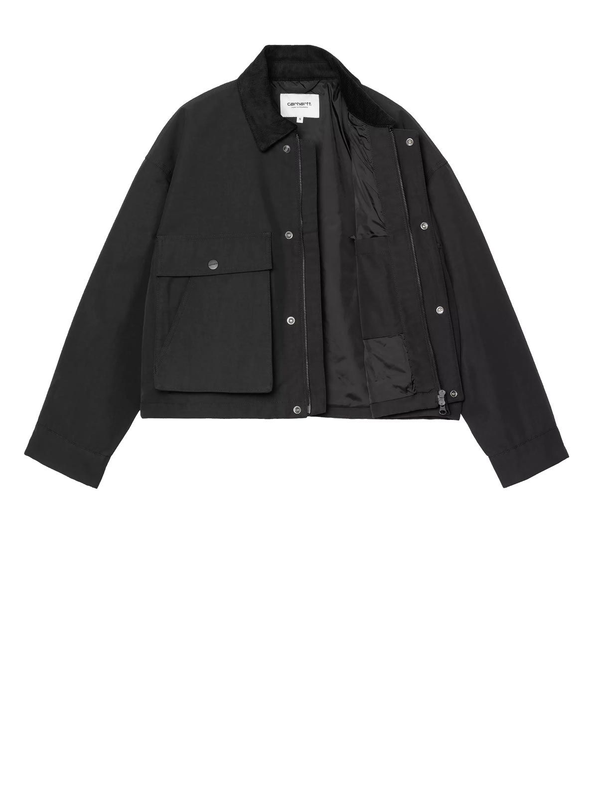 La giacca Carhartt Dunham nera da donna unisce funzionalità e stile in una silhouette leggermente squadrata, perfetta per affrontare le giornate più piovose con carattere. Realizzata in nylon impermeabile e completa di fodera in nylon, offre protezione dagli agenti atmosferici senza rinunciare al design: il colletto in velluto aggiunge un tocco raffinato, mentre polsini e orlo regolabili garantiscono una calzata personalizzata. La chiusura anteriore nascosta con zip e bottoni automatici, le due ampie tasche applicate con accesso laterale e il ricamo del logo sul petto completano la giacca Carhartt Dunham nera da donna, rendendolo un equilibrio perfetto tra praticità e stile urbano.
