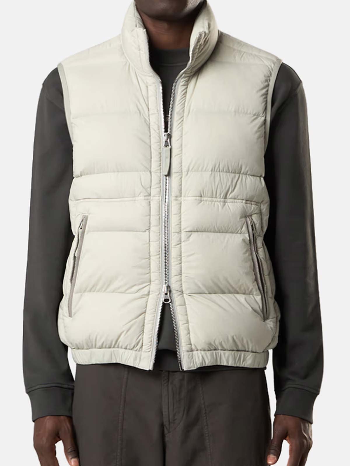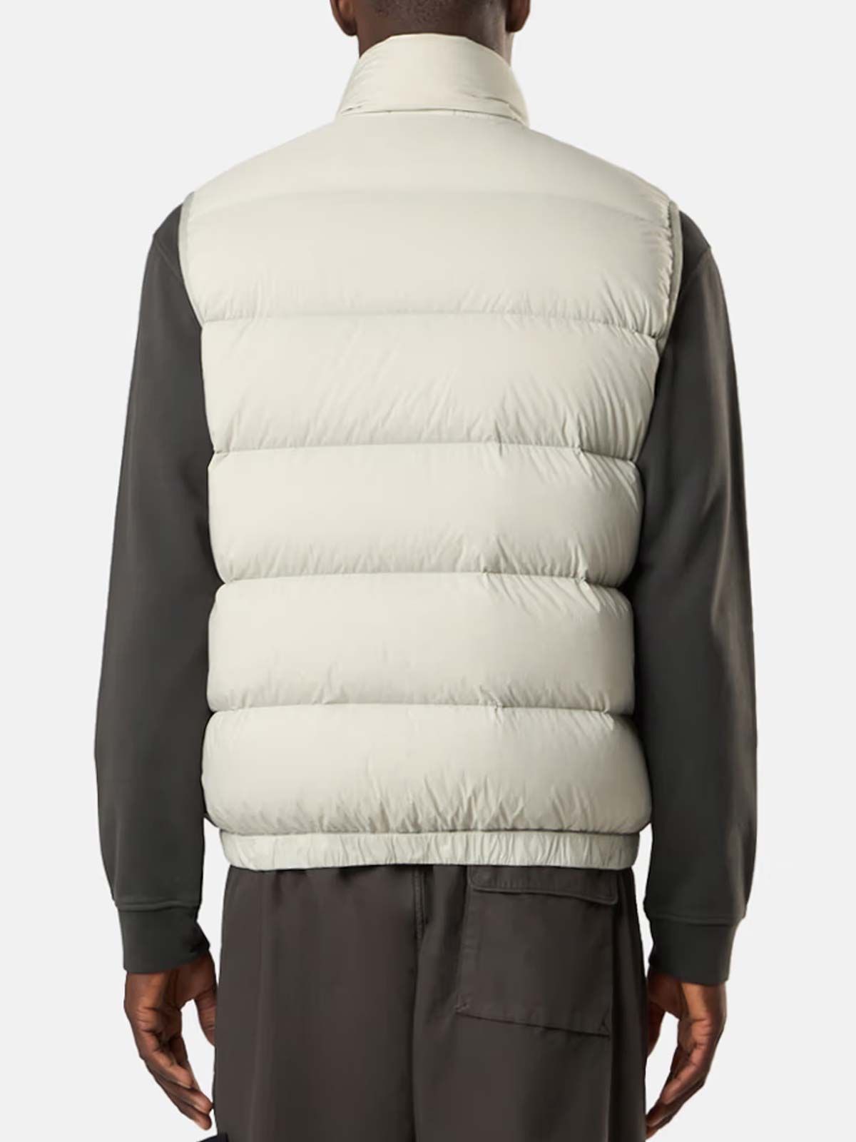 Elementi funzionali come il colletto robusto, le tasche con cerniera discreta e i dettagli in fettuccia sui giromanica si fondono con la praticità della chiusura a cerniera a doppio cursore e l'orlo inferiore elasticizzato. L'iconico badge Stone Island posizionato sul fondo a sinistra completa il gilet Stone Island grigio perla in piuma, rendendolo un vero e proprio capo estremamente versatile, ideale per chi ricerca un'espressione di stile audace e tecnologicamente avanzata.
