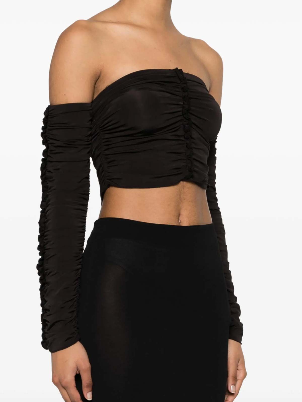 Il collo quadrato dona una raffinatezza inaspettata, mentre le maniche lunghe a sbuffo creano un volume sofisticato, aggiungendo un elemento di tendenza al tuo look. I dettagli arricciati sul lato scolpiscono la silhouette e introducono un movimento dinamico, rendendo il top unico nel suo genere.