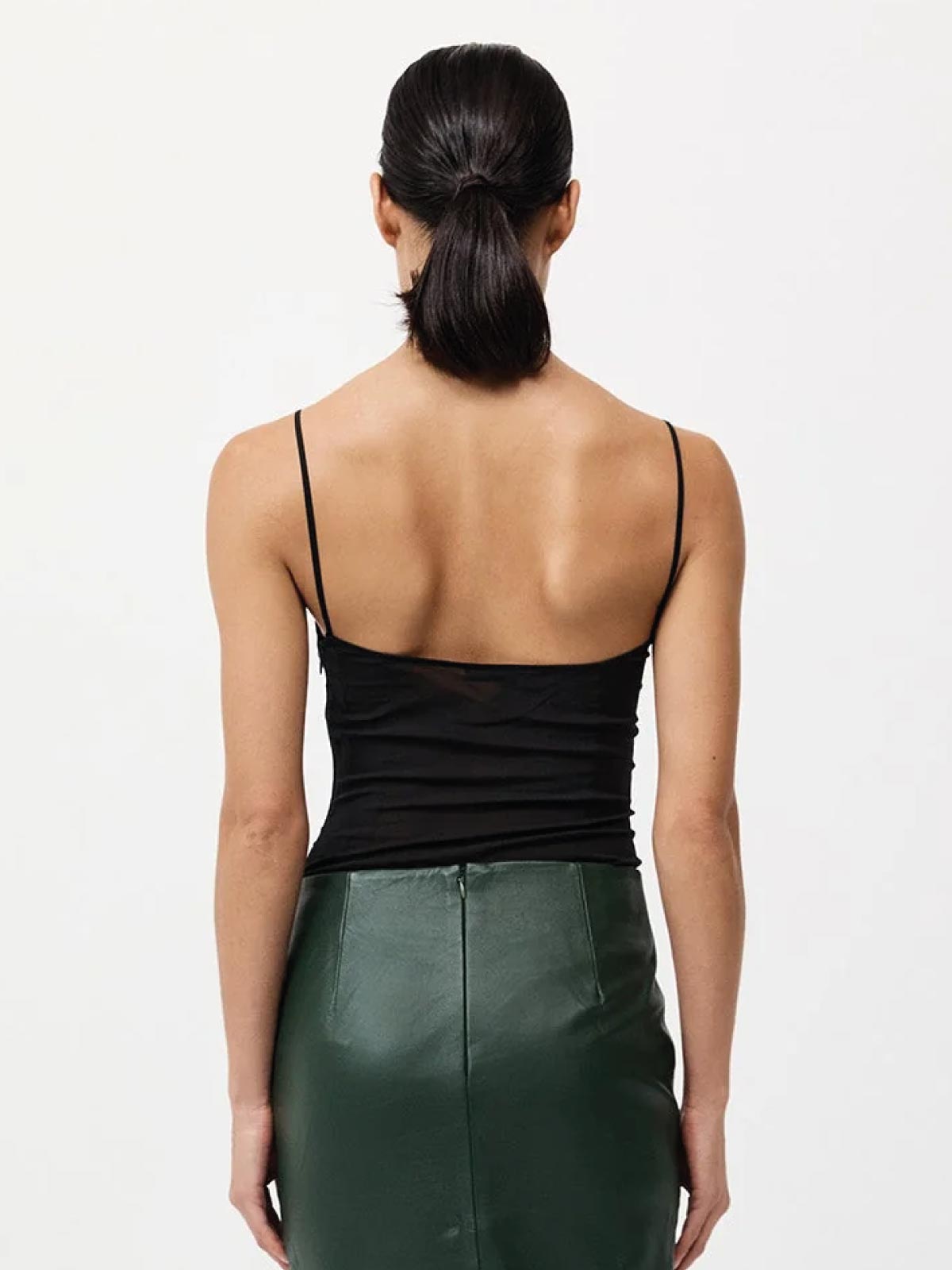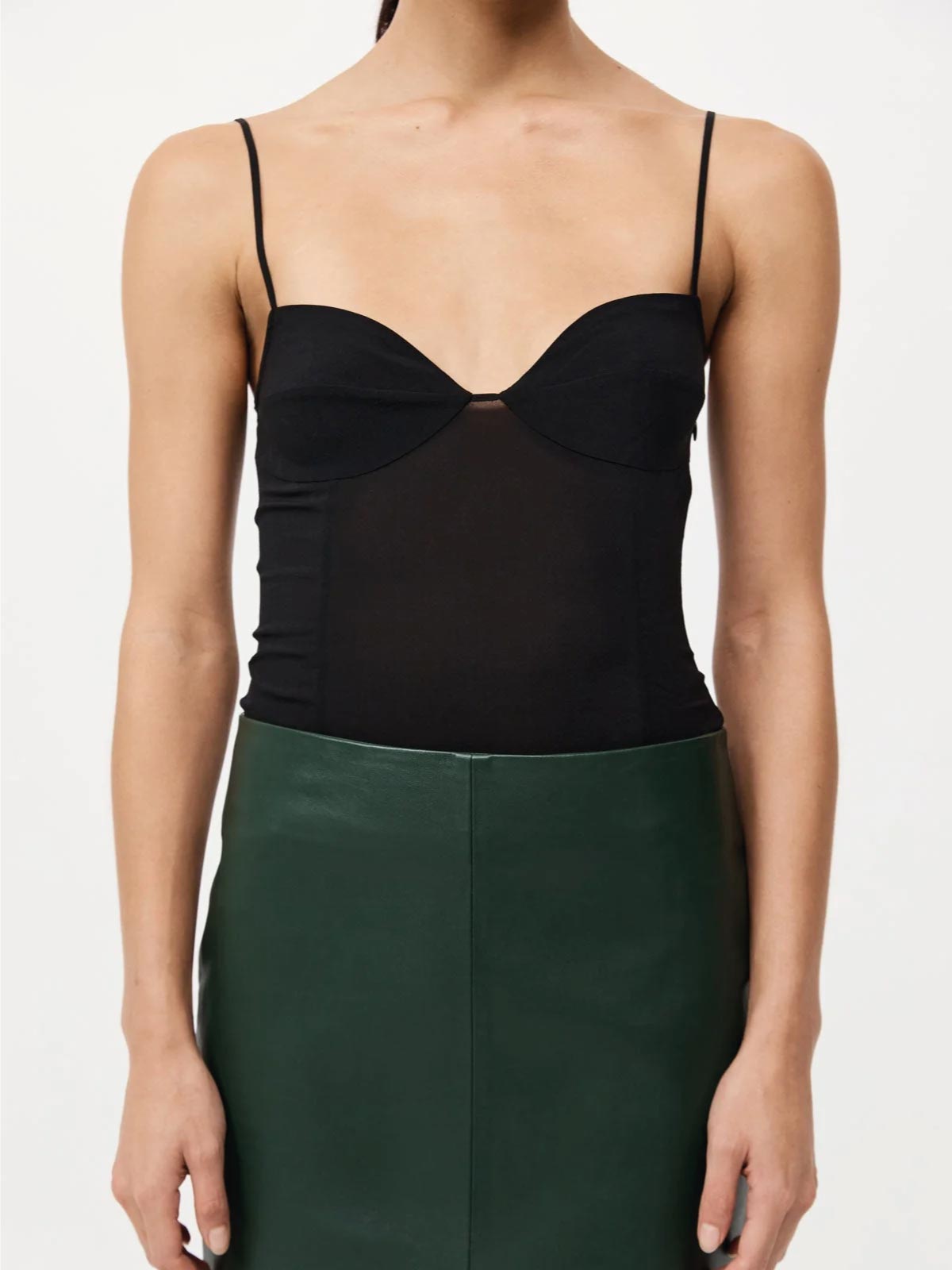 La canotta in seta nera St Agni è un omaggio raffinato alla lingerie degli anni '90 che sa fondere femminilità intrinseca con l'estetica del minimalismo moderno per eccellenza. Questo capo essenziale e sofisticato è definito da un seducente scollo a cuore e coppe foderate, che assicurano struttura e sostegno. Il design è impreziosito da sottili spalline e da raffinati inserti pannellati che disegnano elegantemente la silhouette sia sul davanti che sul retro.