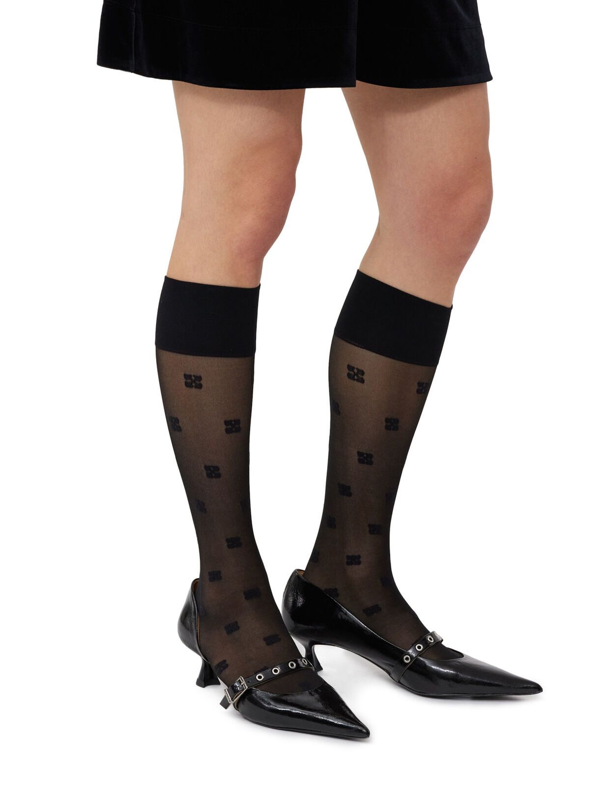 Le calze in pizzo nere Ganni sono l'accessorio per eccellenza: arrivano fino al ginocchio e sfoggiano l'iconico motivo GANNI Butterfly. Un tocco giocoso e autentico per elevare ogni tuo look.