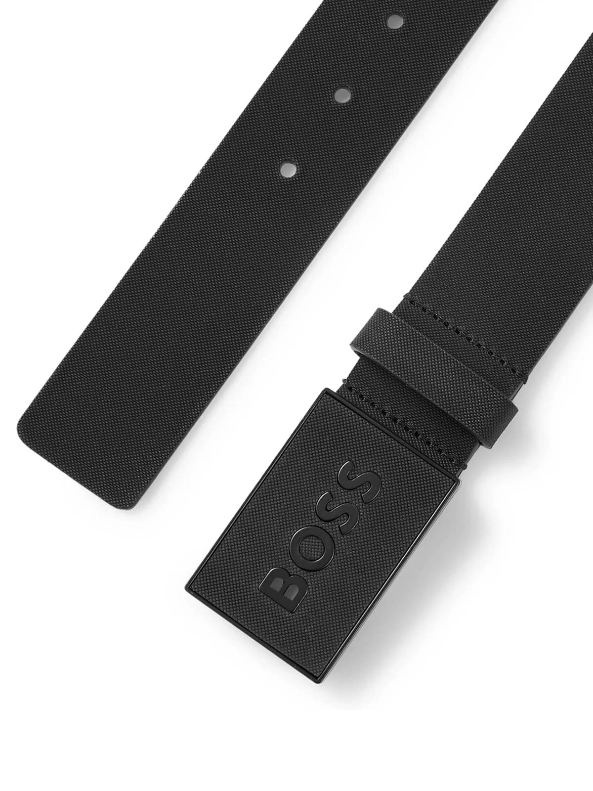 Eleva il tuo stile con questa cintura Hugo BOSS nera da uomo, un accessorio interamente prodotto in Italia. Confezionata in finissima pelle italiana lavorata, si distingue per la sua fibbia con placchetta logo in metallo verniciato nero, un dettaglio che conferisce un tocco di sofisticata modernità.