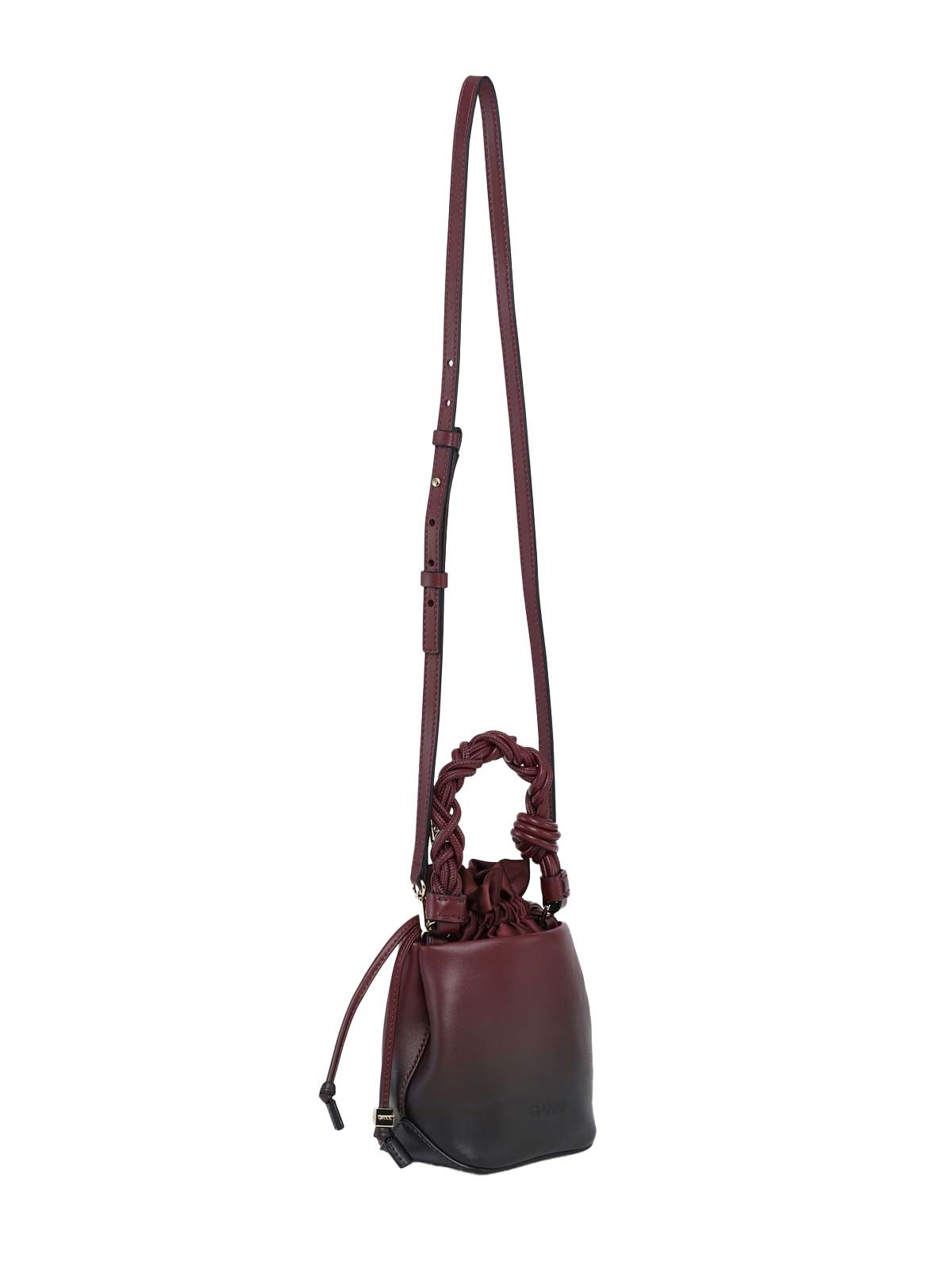 Questa borsa a secchiello Ganni rosso sfumato sfoggia un'elegante maniglia superiore intrecciata, arricchita da un dettaglio a nodo annodato, e si completa con una tracolla regolabile e staccabile per la massima versatilità. Al suo interno, troverai una pratica pochette con coulisse, impreziosita dal logo GANNI in rilievo sul retro, e una comoda tasca piatta.