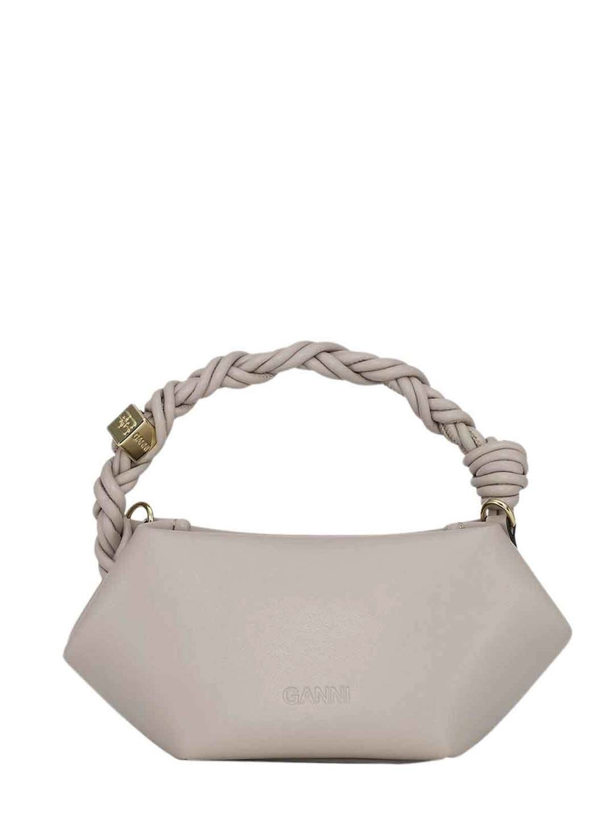 Ti presentiamo la borsa Ganni Bou Bag Mini grigio oyster, una nuova affascinante interpretazione di uno stile iconico. Questa versione più piccola è altrettanto accattivante, caratterizzata da un logo a farfalla metallico tono su tono e un manico attorcigliato con un dettaglio annodato che aggiunge un tocco unico. Un ciondolo a dado dorato, finemente inciso con l'iconico motivo Ganni, completa il design.