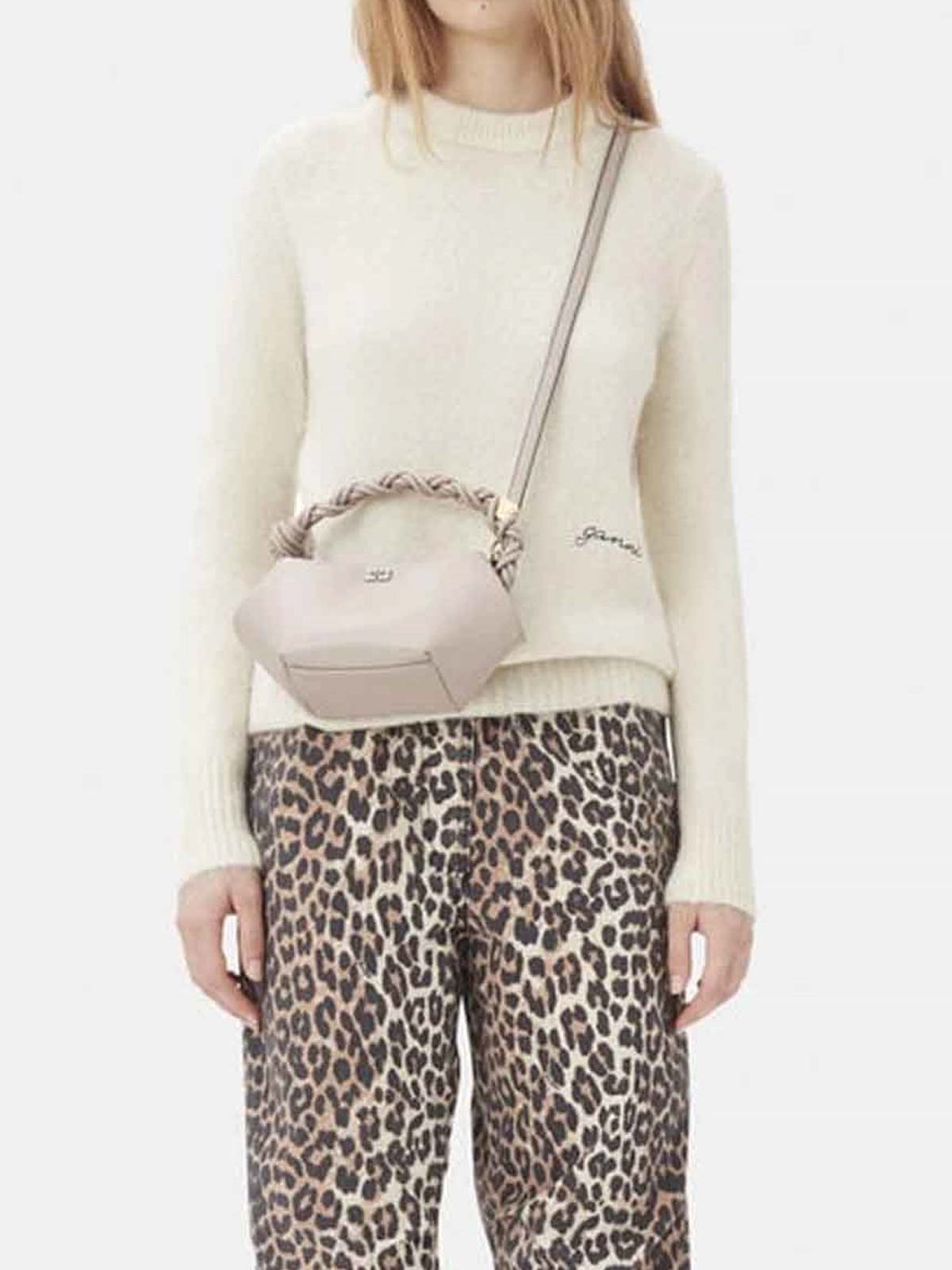 All'interno, troverai una chiusura magnetica interna per la sicurezza e una tasca piatta perfetta per le tue carte. Con la sua tracolla regolabile e rimovibile, la borsa Ganni Bou Bag Mini grigio oyster puoi indossarla a tracolla per una maggiore praticità o portarla a mano per un look chic e compatto. È l'accessorio mini perfetto per elevare qualsiasi outfit.