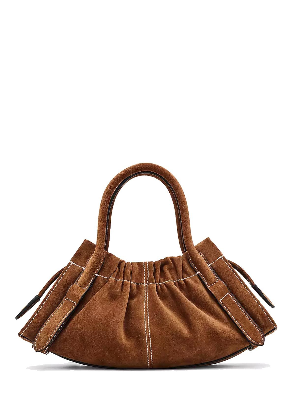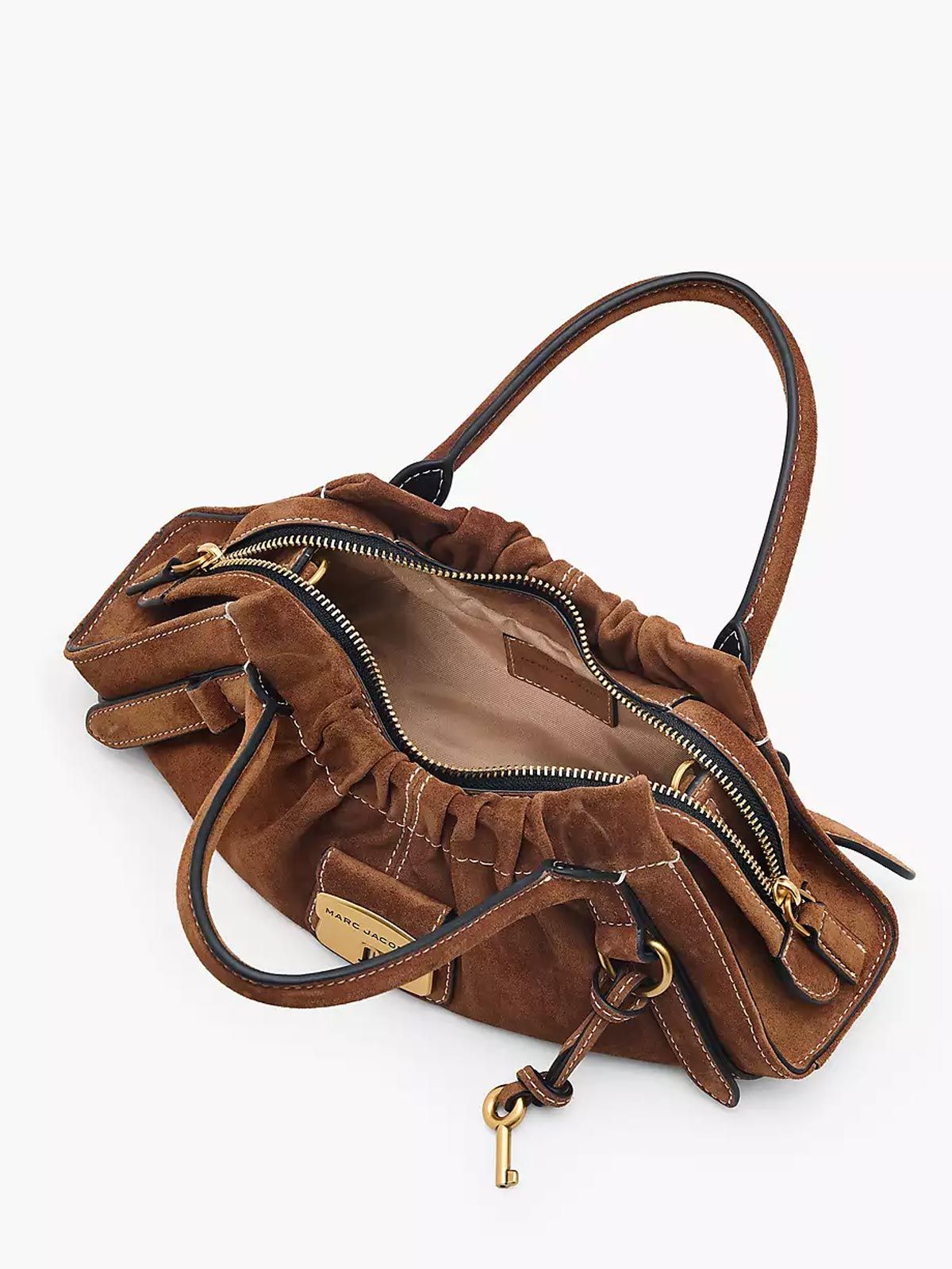 Lei non è solo una borsa: è una dichiarazione sussurrata di lusso. La borsa Marc Jacobs Cristina small Satchel marrone emerge dalle collezioni storiche del brand, riproposta in una sontuosa pelle scamosciata che accarezza lo sguardo e il tatto. Il suo tratto distintivo, quella particolare lavorazione drappeggiata è un elemento che mantiene intatta la sua notorietà, mentre la metalleria, reminiscenza di un lusso d'epoca, ne sigilla l'autenticità.