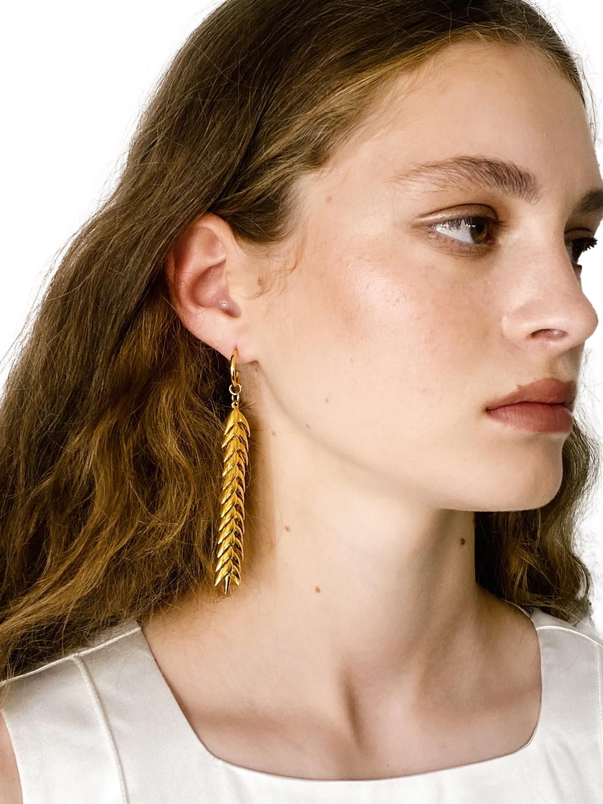 BEVZA reinterpreta con maestria i simboli ancestrali ucraini in questi splendidi orecchini pendenti a spiga dorati, sui quali i dettagli di grano sembrano muoversi con grazia. Realizzati in ottone placcato oro 18 carati, questi orecchini da dobnna non sono semplici accessori, ma un tributo al dono della natura: il grano è infatti un antico emblema di fertilità e raccolti abbondanti.