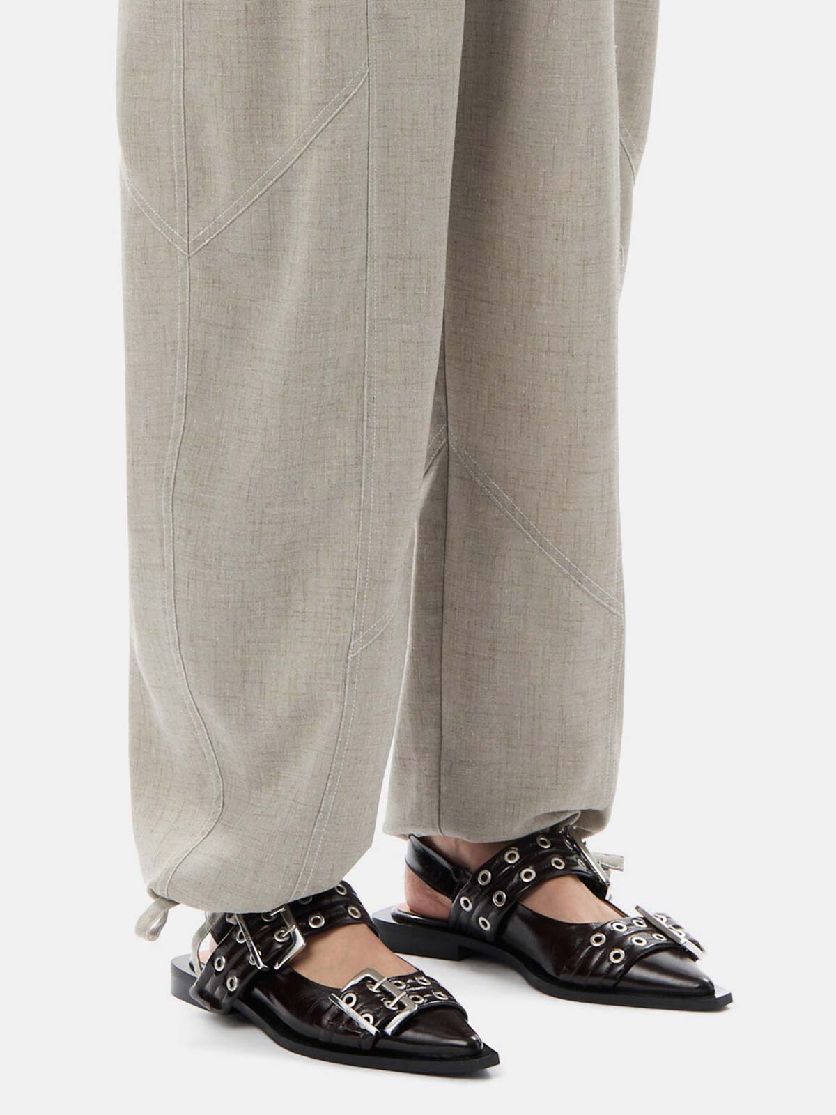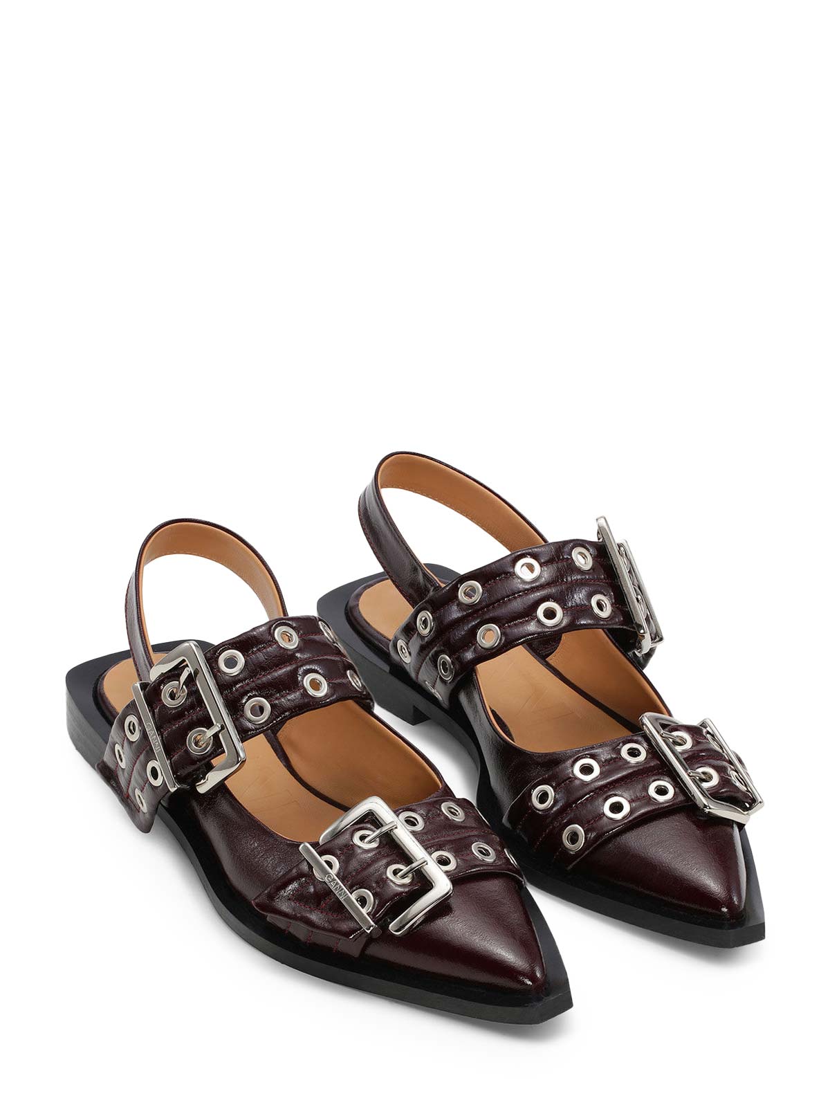 Un capo essenziale versatile rinasce: queste ballerine Ganni bordeaux con fibbia sono tutt'altro che comuni. Con una silhouette che rompe gli schemi, si distinguono per il loro design open-toe, impreziosito da occhielli e fibbie in metallo argentato che donano un'eleganza grintosa. La graziosa punta affusolata completa il look di queste calzature, realizzate con un occhio di riguardo all'ambiente grazie a una miscela che include il 51% di poliestere riciclato.