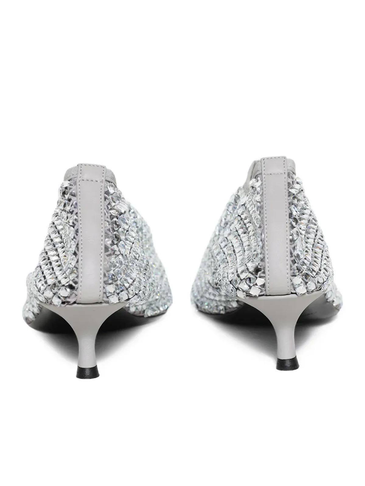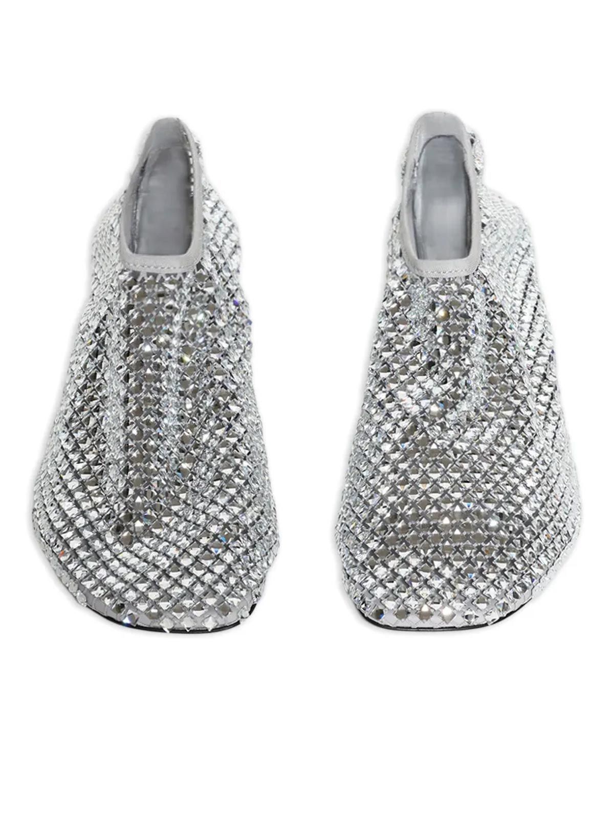 Ogni paio è un pezzo unico, grazie alla rete a maglie finemente intessuta e ai cristalli di vetro applicati a mano, che catturano la luce e creano un gioco di riflessi scintillanti. Il micro tacco di 50 mm slancia la figura, permettendoti di mantenere eleganza e stabilità a ogni passo.