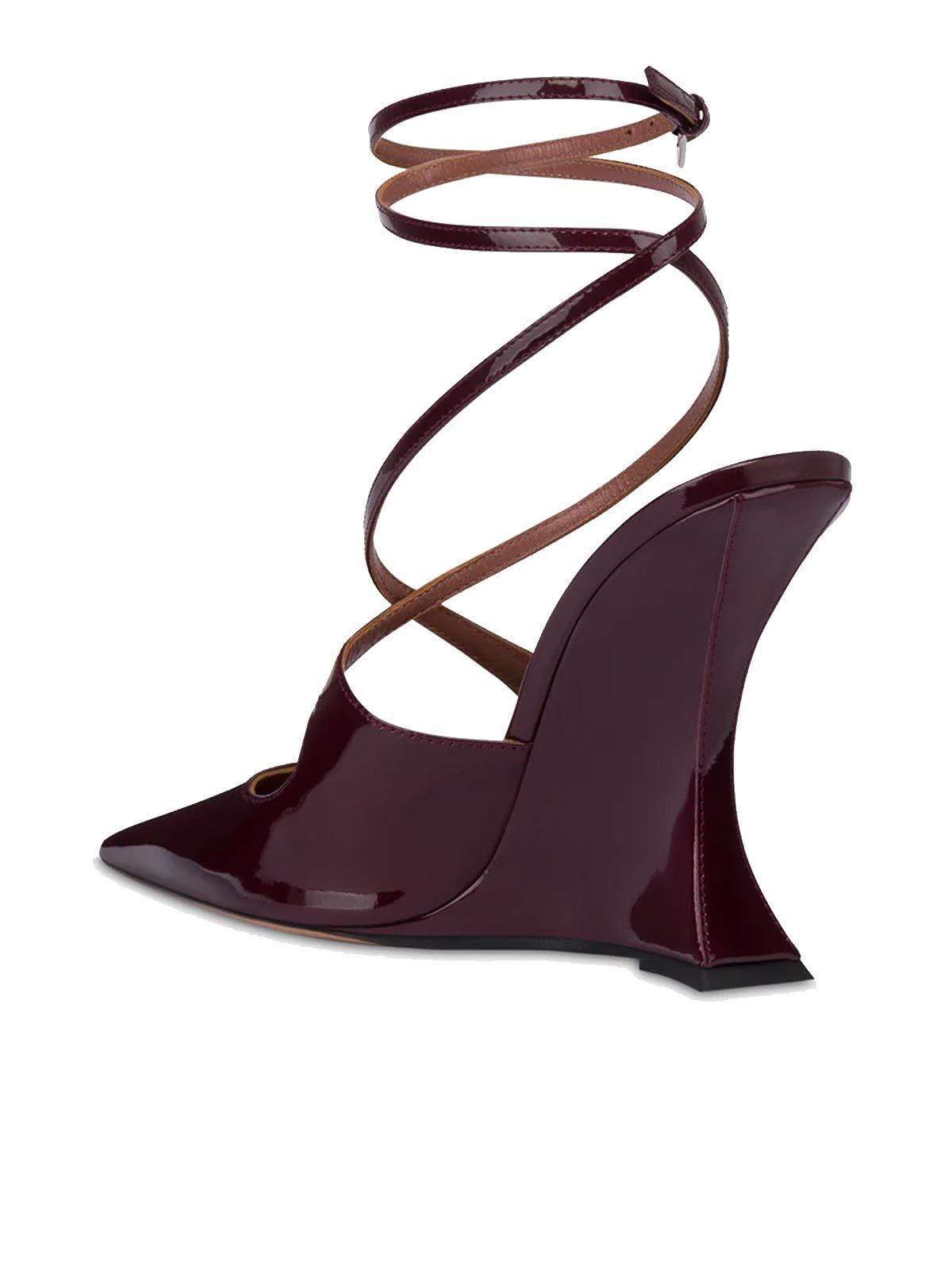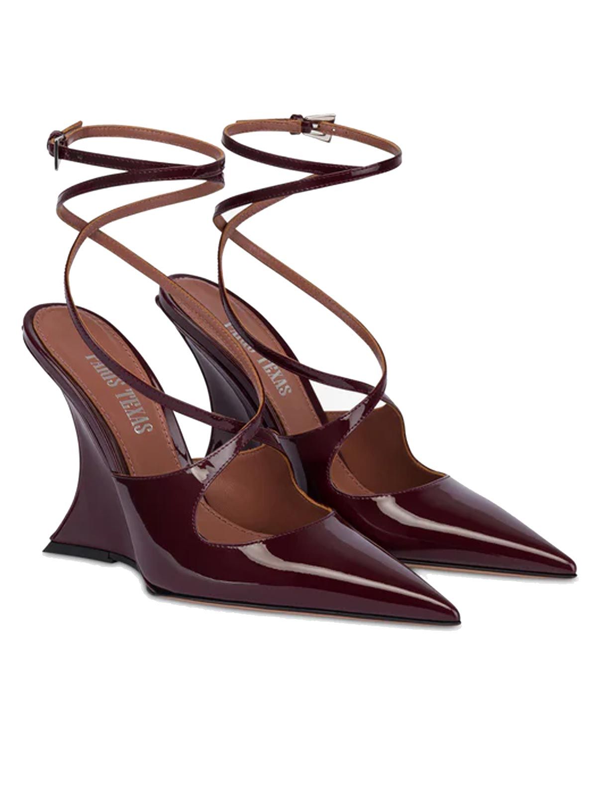 La silhouette a punta affusolata allunga elegantemente la gamba, mentre il cinturino alla caviglia aggiunge un tocco di sensualità e garantisce una calzata stabile e sicura. Il tratto distintivo di questo modello è il tacco a zeppa rivestito alto 105 mm: una soluzione che offre l'altezza di un tacco a spillo, unita al comfort e al sostegno superiore tipici della zeppa.