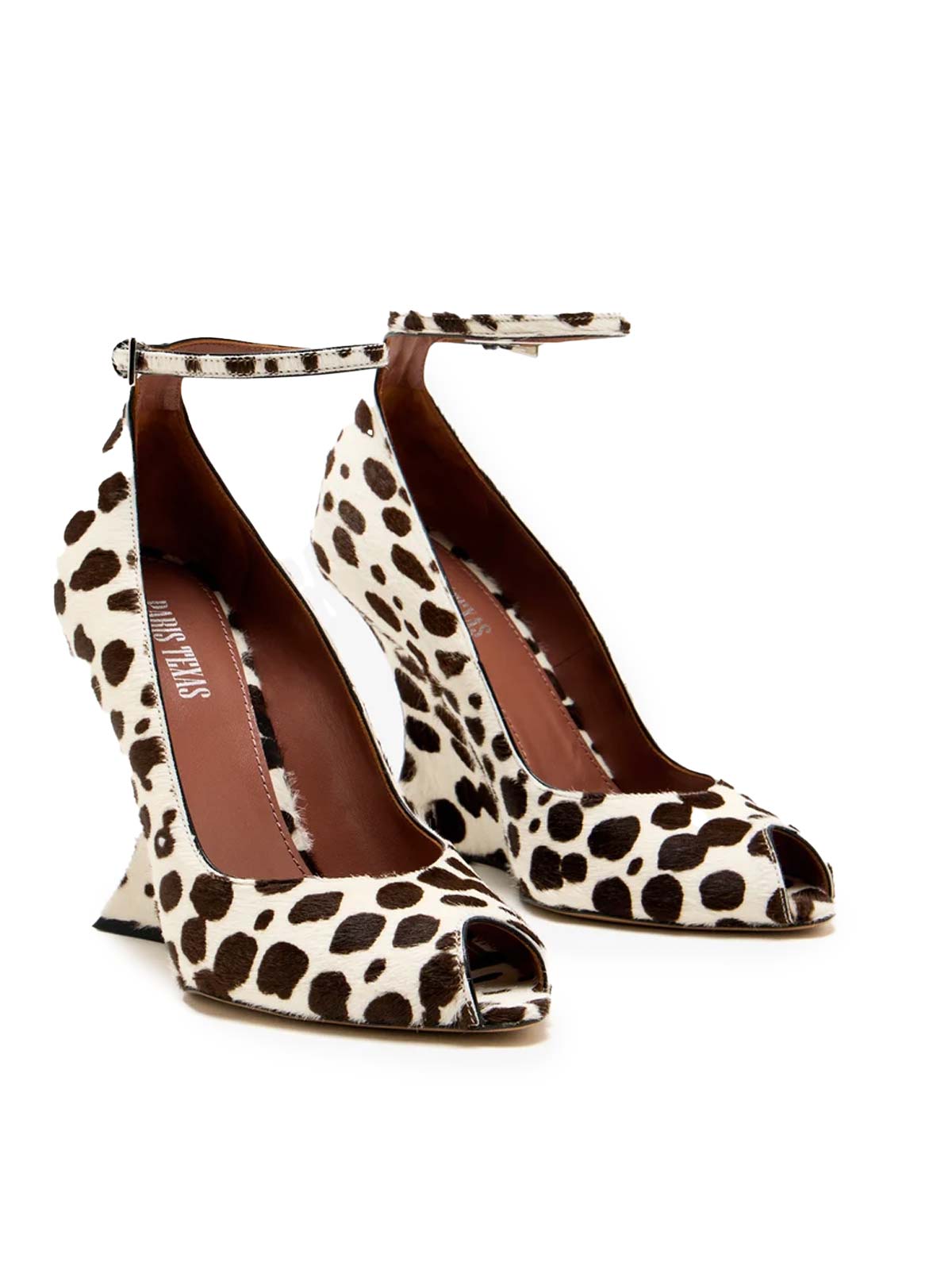 Realizzate artigianalmente in Italia, queste pumps open-toe Paris Texas in cavallino si distinguono per il raffinato cavallino stampato bianco e marrone scuro, che le rende uniche. Il design è completato da un elegante cinturino alla caviglia e un tacco a zeppa rivestito di 105mm che slancia la figura con grazia. Ogni paio include un pratico sacchetto antipolvere, garantendo stile e cura in ogni dettaglio.