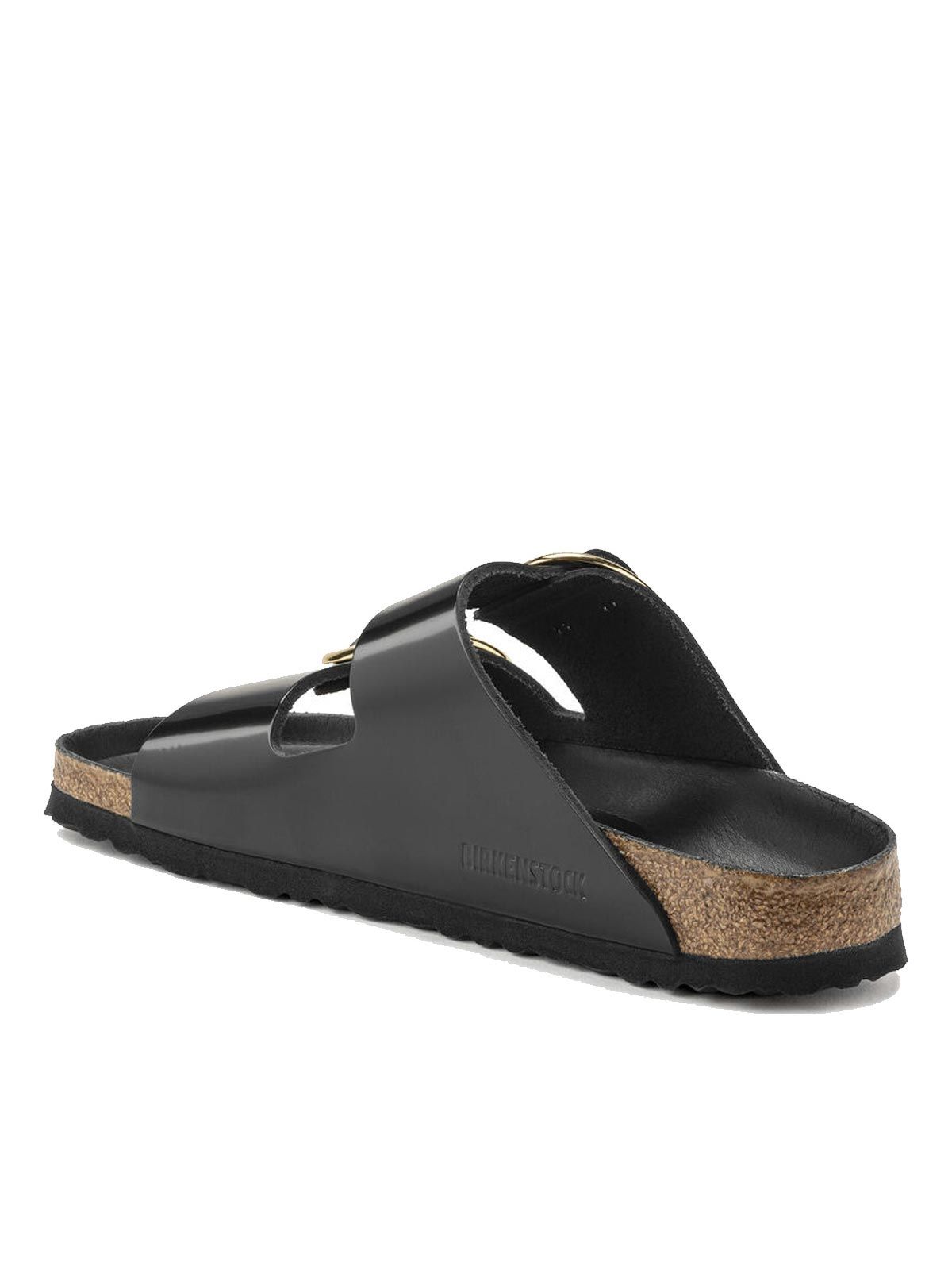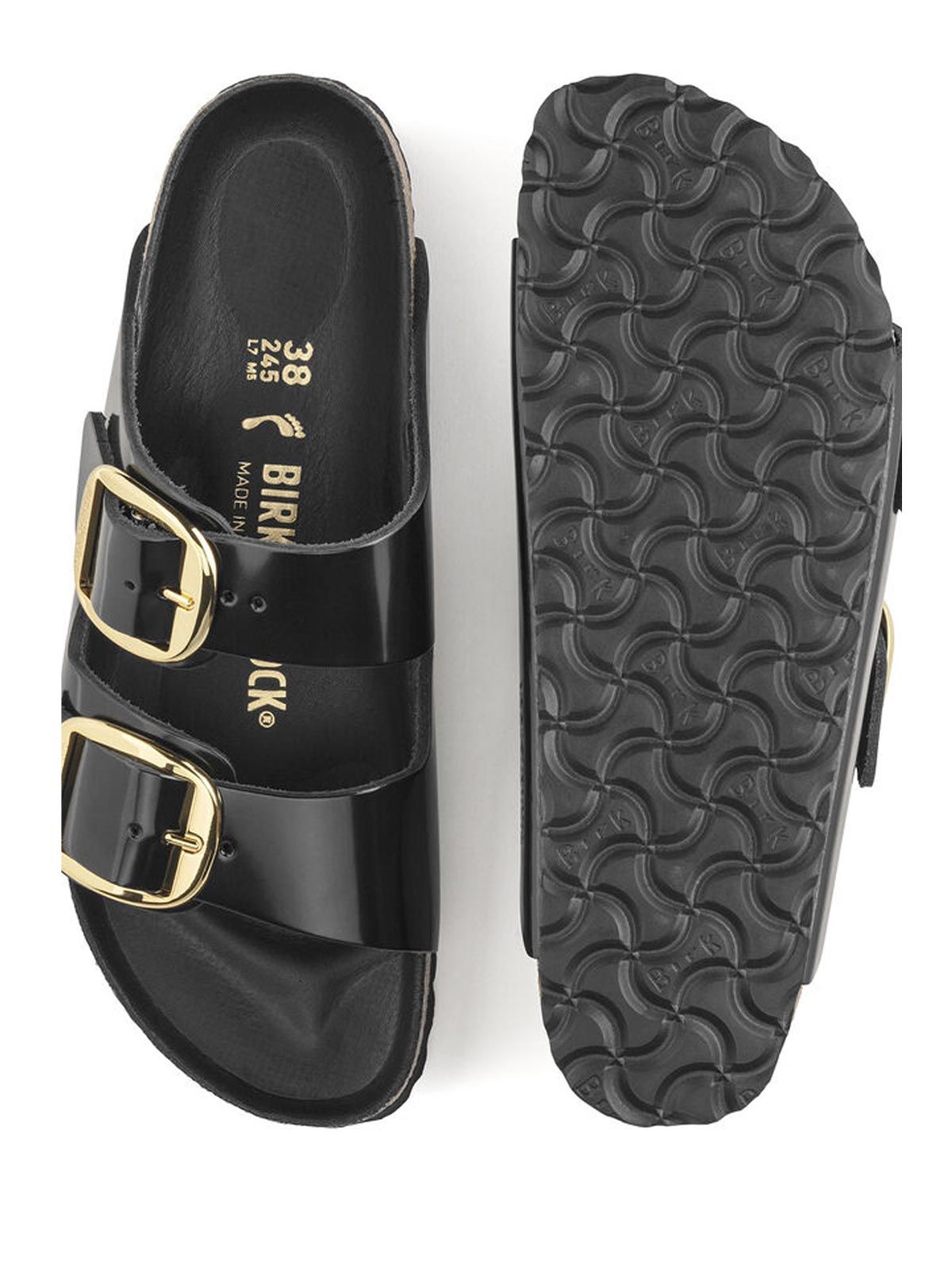 La tomaia, realizzata in pregiata pelle naturale con una lucente finitura laccata, dona un’eleganza sofisticata, rendendo le BIRKENSTOCK Arizona Big Buckle nere perfette per chi cerca un modello classico ma ricco di carattere.