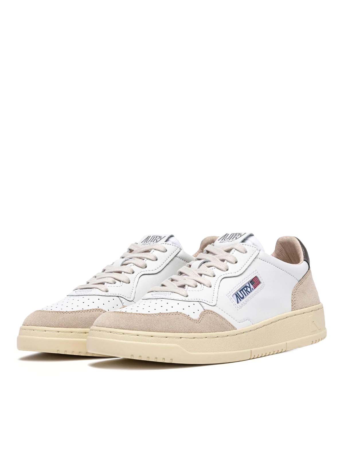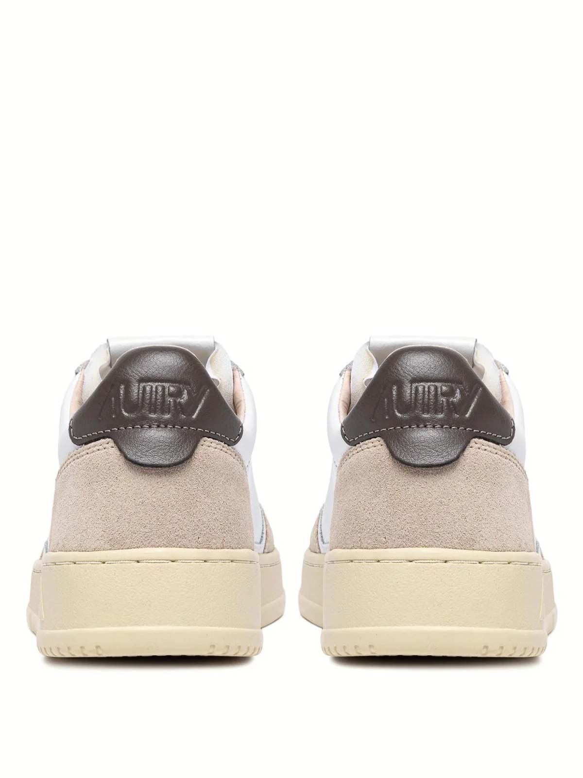 Le sneakers Autry Medalist Low bianche e marroni rielaborano l'estetica del tennis anni '80 con proporzioni attuali e materiali di pregio. Questa calzatura da uomo presenta una tomaia in morbida pelle bianca autentica, completata da rinforzi in suede beige che creano un ricco contrasto tattile. Il tallone è impreziosito da un dettaglio in pelle marrone con l'iconico logo Autry.