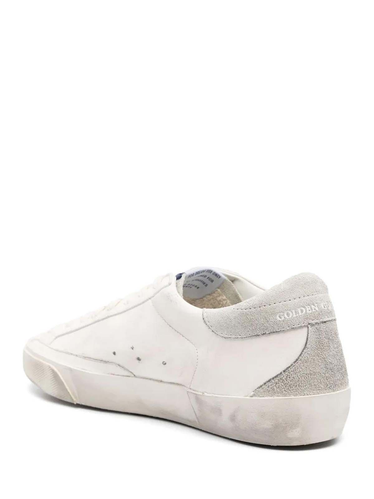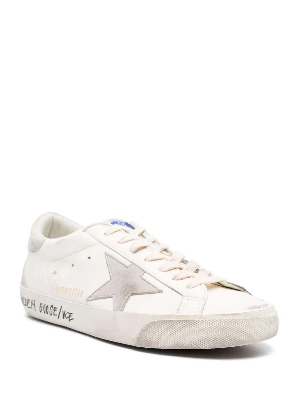 L'inconfondibile stella laterale a contrasto, il lettering dorato "GGDB/SSTAR" e la patch logo sulla linguetta conferiscono un'identità unica. Il tallone in camoscio è rifinito con il logo "Golden Goose" in bianco, mentre la suola in gomma, anch'essa con effetto vissuto, mostra il lettering "Golden Goose/VCE". La perfetta fusione di dettagli retrò e finiture moderne rende queste sneakers Super Star Golden Goose bianche un accessorio essenziale per ogni guardaroba.