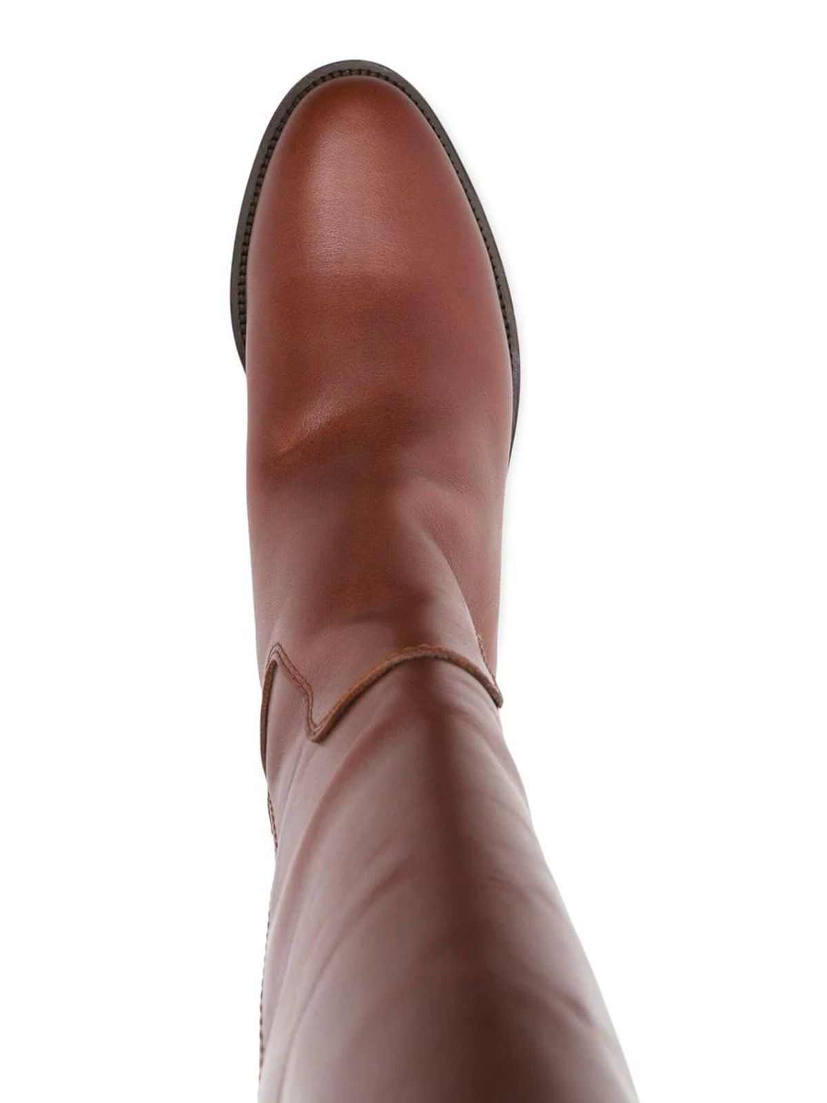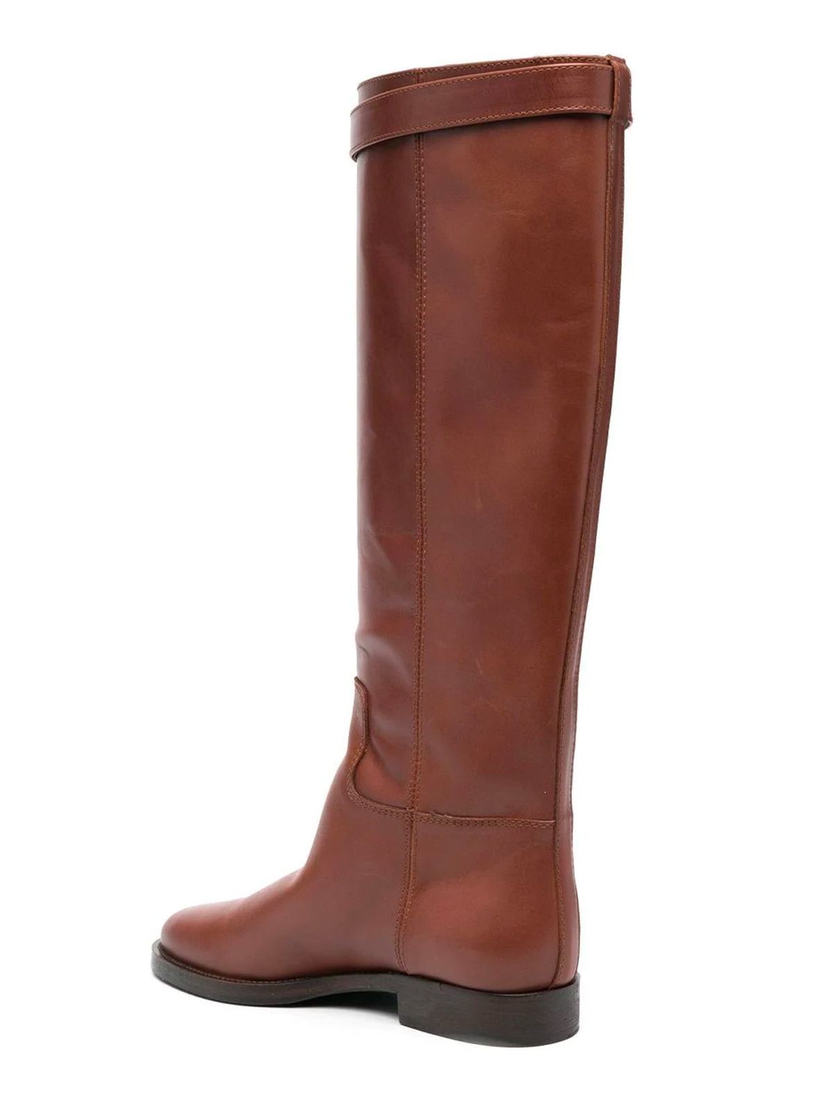 Realizzato in morbida pelle di vitello, il gambale presenta geometrie definite e un originale accessorio: un cinturino in pelle che si può togliere, dotato di un attacco metallico girevole posizionato sulla parte superiore, che misura 41 cm in altezza. È proprio questo dettaglio a donare una nota distintiva al loro portamento elegante.