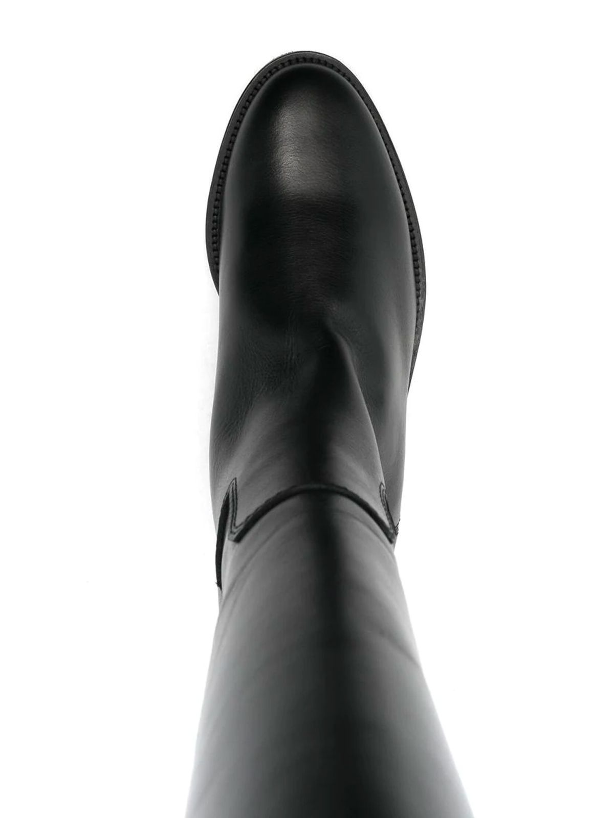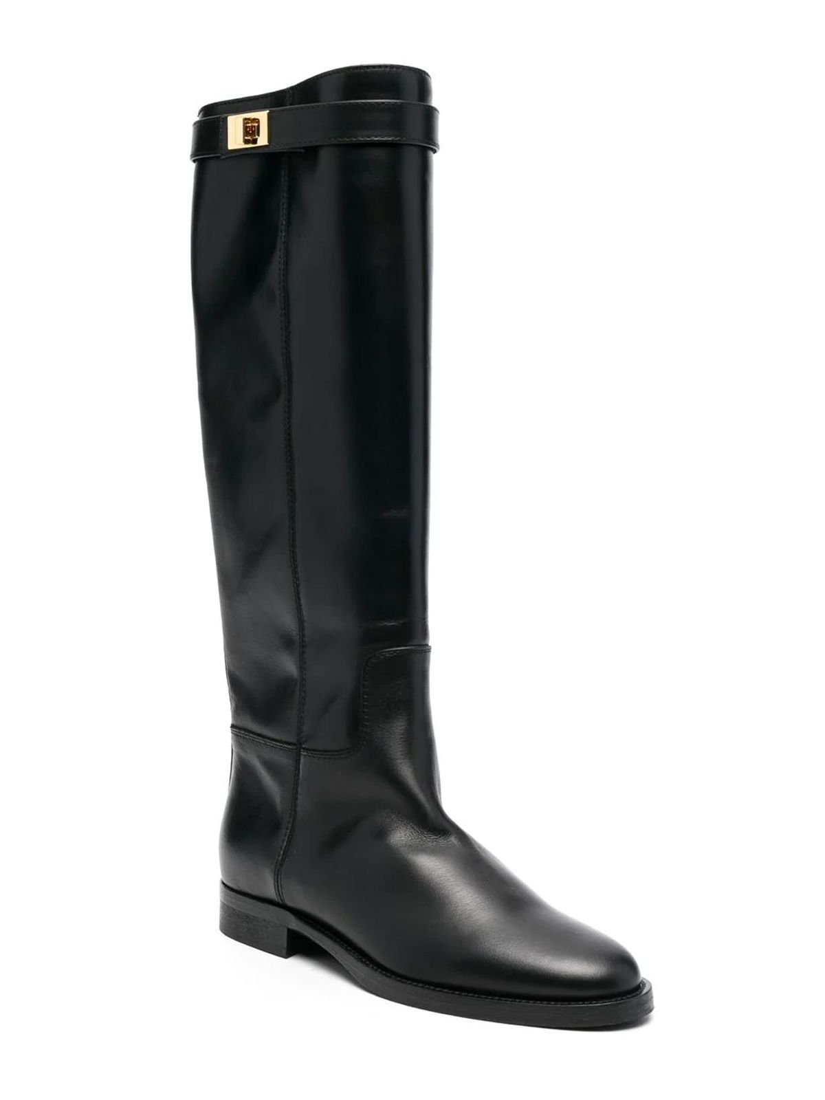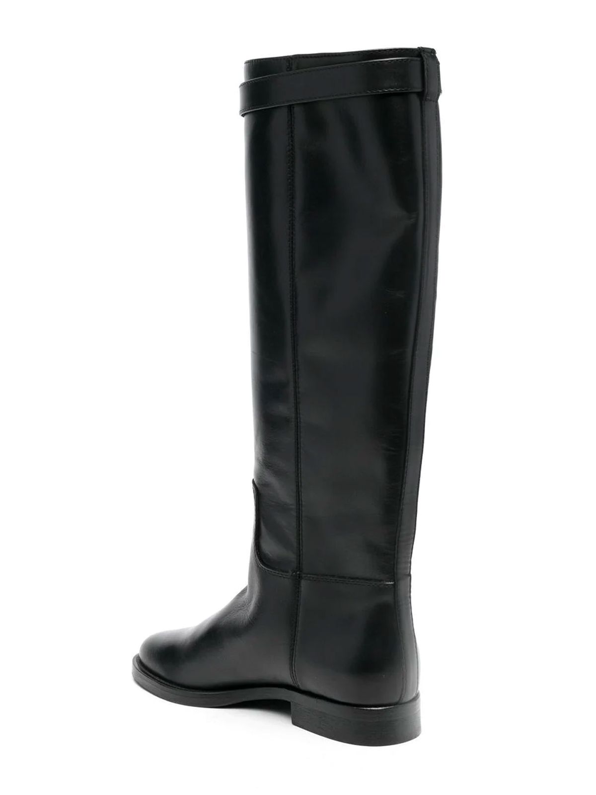Realizzati in morbida pelle di vitello, il gambale ha linee definite ed è arricchito da un dettaglio speciale: un cinturino in pelle removibile con chiusura metallica a girello, posizionato sulla parte superiore, alto 41 cm. È questo elemento che dona un tocco distintivo al loro stile raffinato.